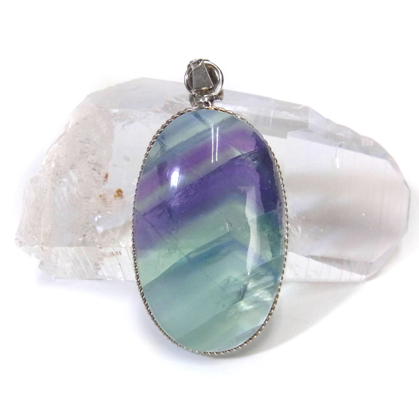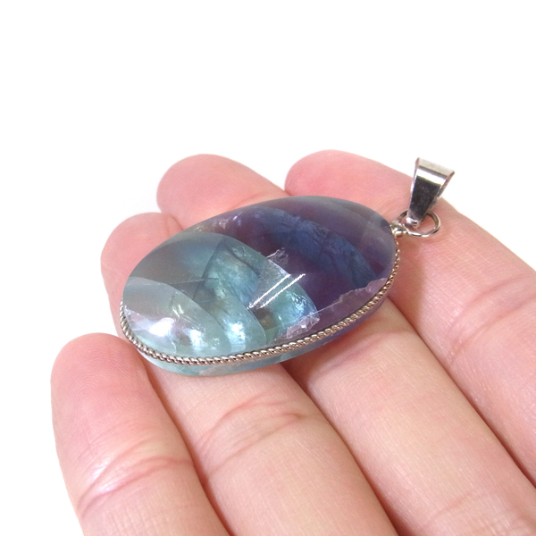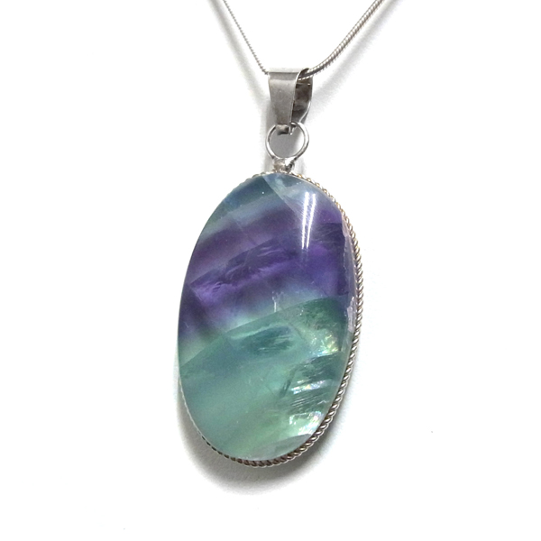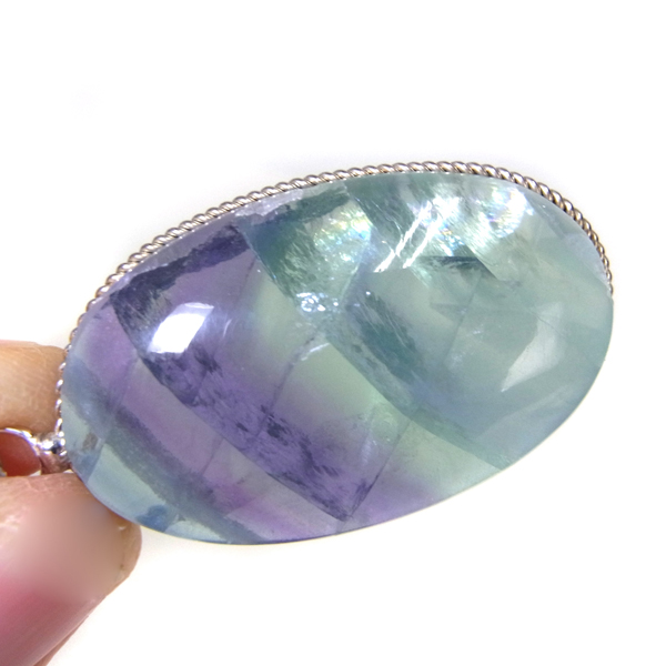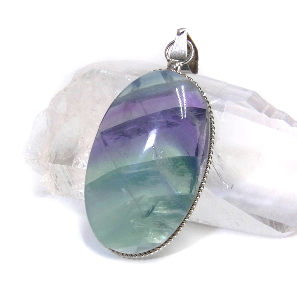 メキシコ産フローライトのペンダントトップです。大きなフローライトのルースに溝を掘り、シルバーの枠で巻いて加工しています。大変透明度の高いフローライトで、一部グリーンとパープルのバイカラーになっています。結晶からレインボーが見られます。存在感のある大きさのペンダントトップで透き通ったフローライトになんとも癒されます。※チェーンは別売りです。