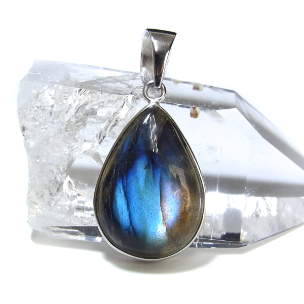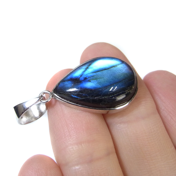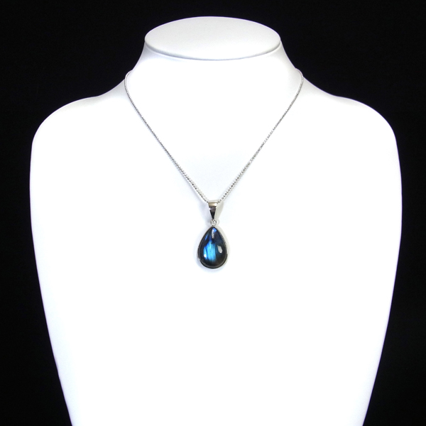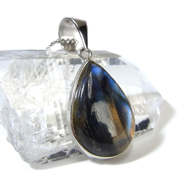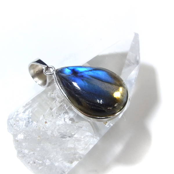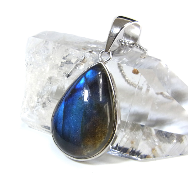 マダガスカル産ラブラドライトのペンダントトップです。ブルーのラブラドレッセンスが見られます。よく見ると小さな内包物が星のようにキラキラと見られ、全体としてラブラドライトの大きな深みを感じます。石の加工はしずく型に艶やかな研磨を施しております。胸元で魅惑のラブラドレッセンスがしっかりと輝きます。