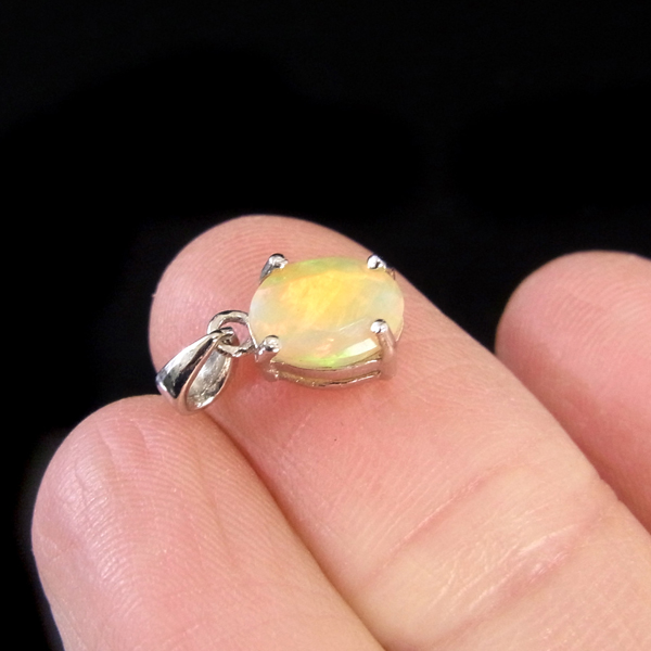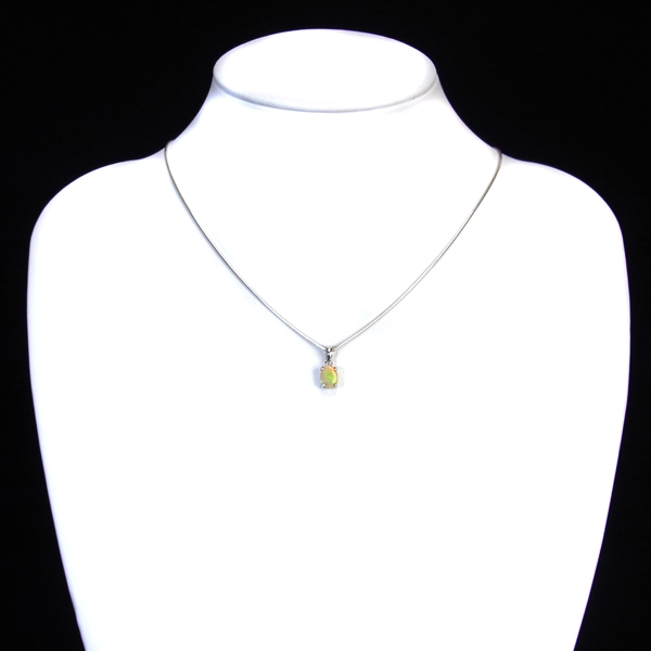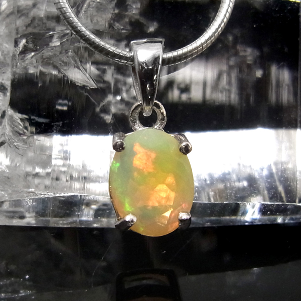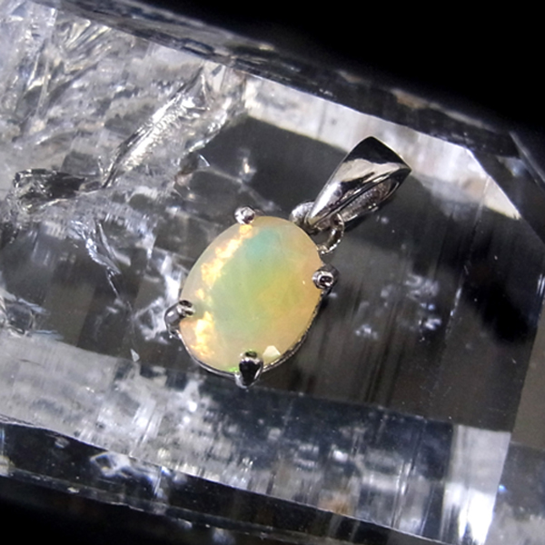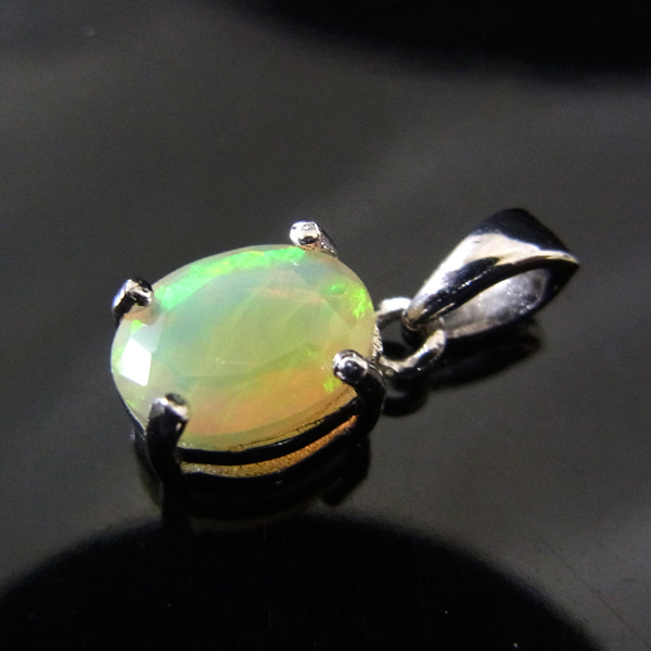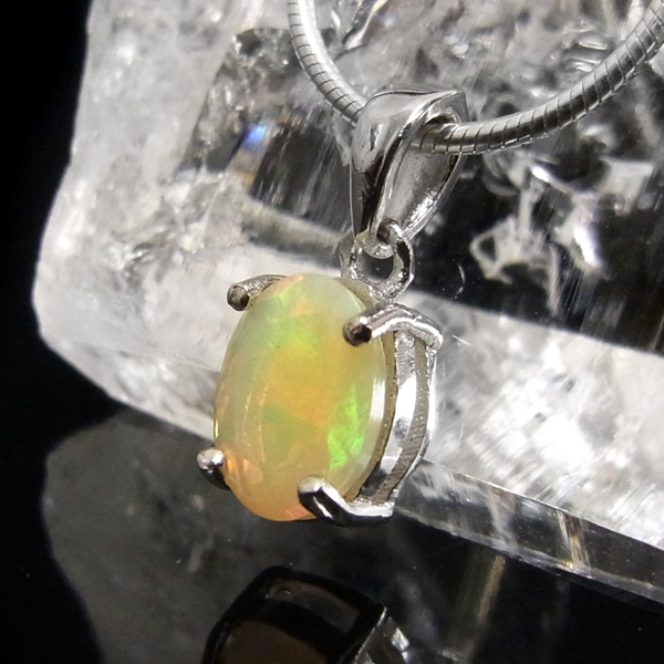 エチオピア産オパールのペンダントトップです。オパールの魅力といえば、虹色に美しく輝く「遊色」です。エチオピア産の遊色が見事な部分だけを贅沢に使用したペンダントトップ。見る角度によって変化しながら虹色に輝くきらめきは、息を呑むほどです。グリーン、オレンジ、レッド、イエロー、ブルーも見られます。歩く度に胸元で石の表情が変わって楽しいアイテムです。