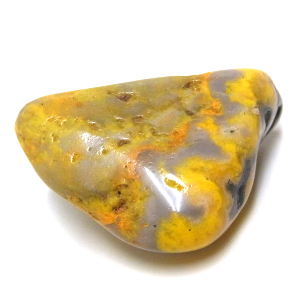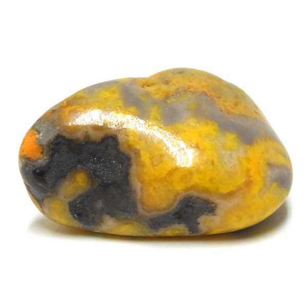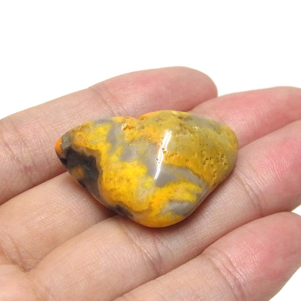 インドネシア産のバンブルビージャスパー、タンブルです。発色とグラデーションが美しいものを選りすぐりました。バンブルビージャスパー、別名エクリプスとも呼ばれます。「バンブルビー」とは、ミツバチの一種のマルハナバチのことで、黒地に蛍光色のイエローの模様からこの名前がつけられました。また、「エクリプス」とは、皆既日食を意味しています。主に硫黄がビビッドな発色を生み出すと言われ、クォーツと他の微量ミネラルで構成されています。世界的にもレアストーンとされていますが、特に日本市場での流通量は非常に少なく、入手困難な石なのです。もし気に入られた場合は、お早めにご購入されることをオススメします。所々に穴があり、ルーペで覗いてみると小さな結晶が見られます。