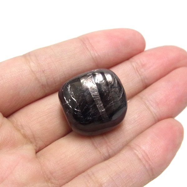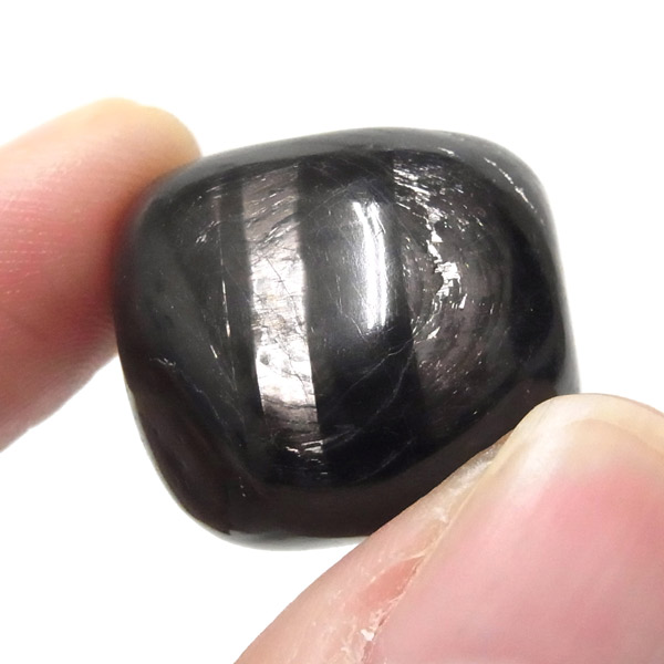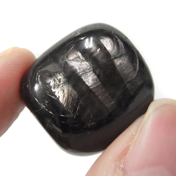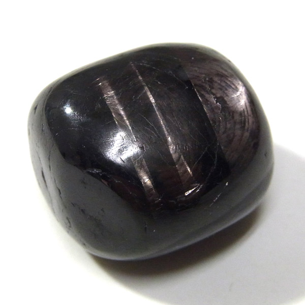 カナダ産のハイパーシーン、タンブルです。大きなグループとしては、クンツァイトやダイオプサイト・翡翠やなどと近縁になります。 和名を「紫蘇輝石」と呼ばれるように、真っ黒の石の中に大変美しい紫色のシラー(輝き)が浮かび上がる、輝石の一種です。