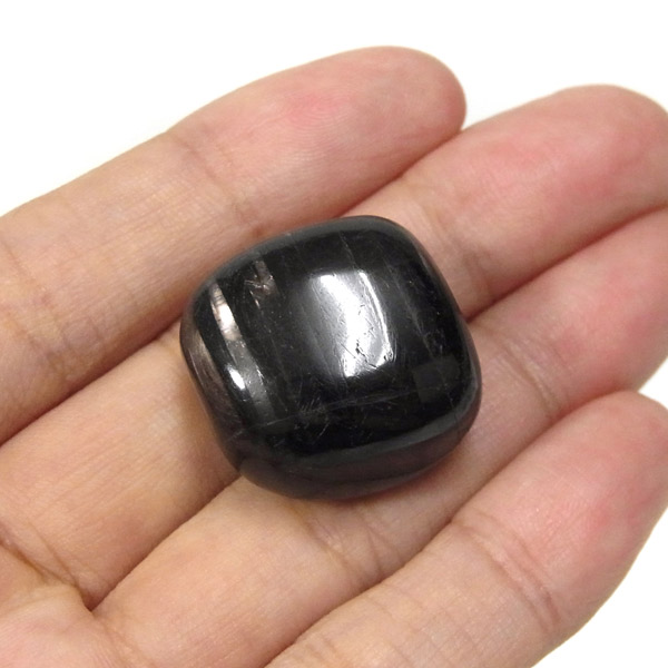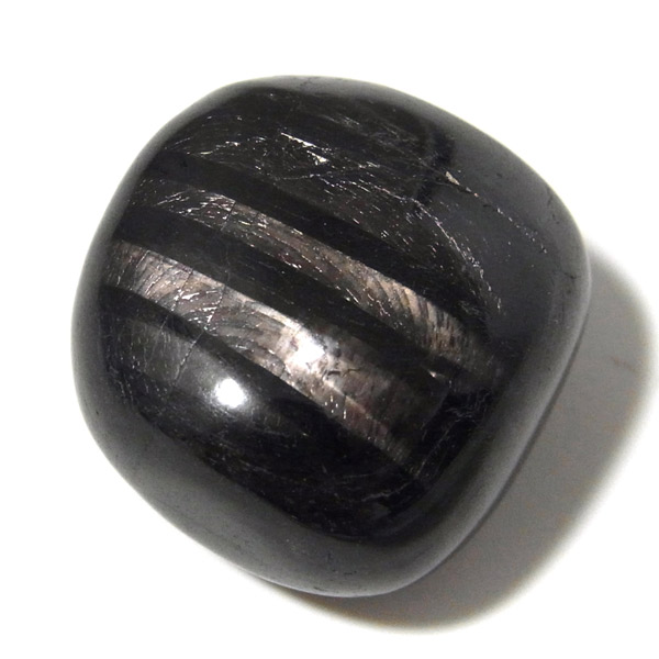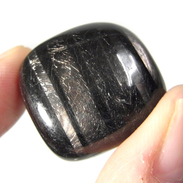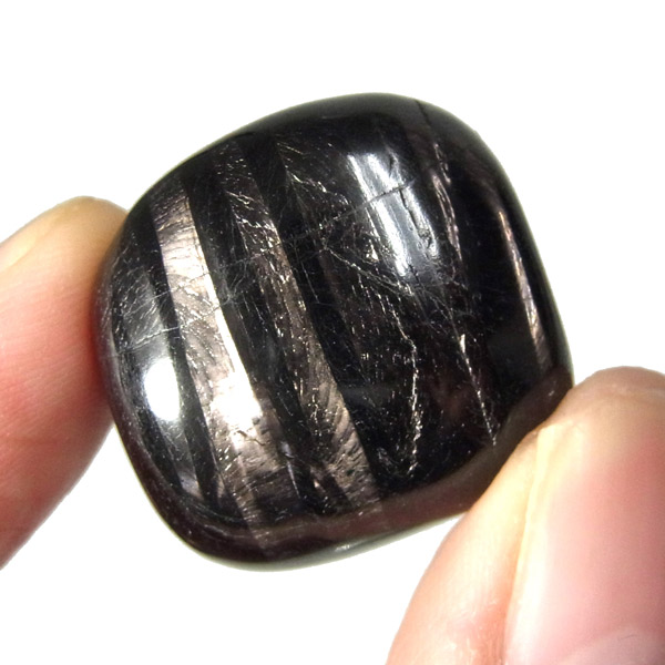カナダ産のハイパーシーン、タンブルです。大きなグループとしては、クンツァイトやダイオプサイト・翡翠やなどと近縁になります。 和名を「紫蘇輝石」と呼ばれるように、真っ黒の石の中に大変美しい紫色のシラー(輝き)が浮かび上がる、輝石の一種です。