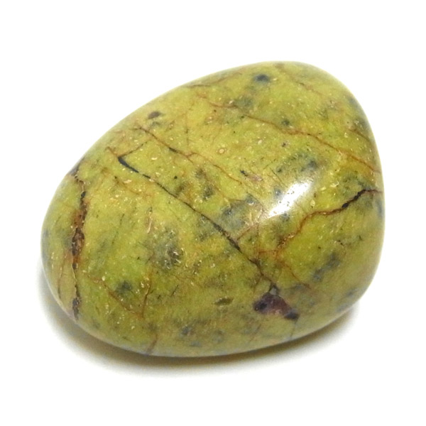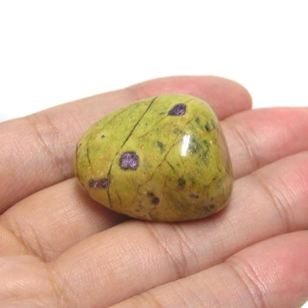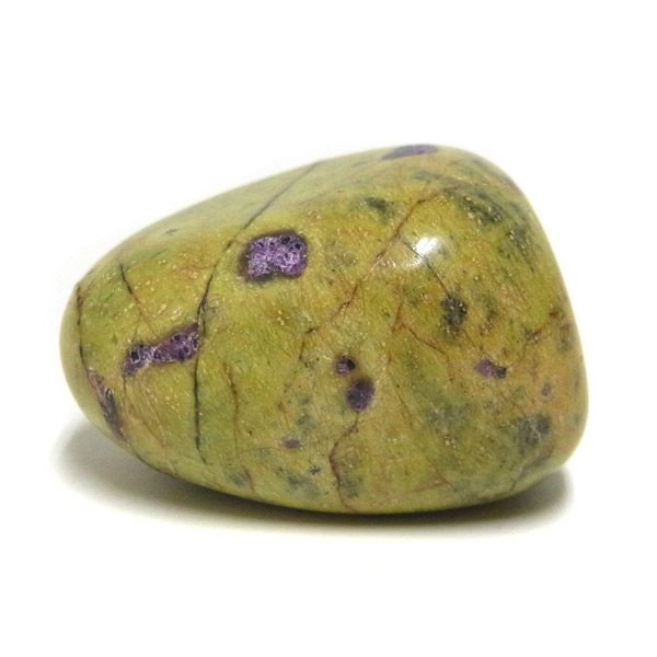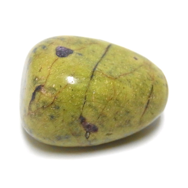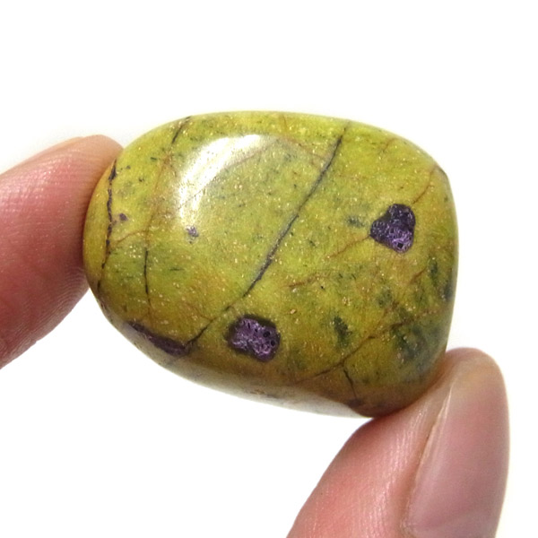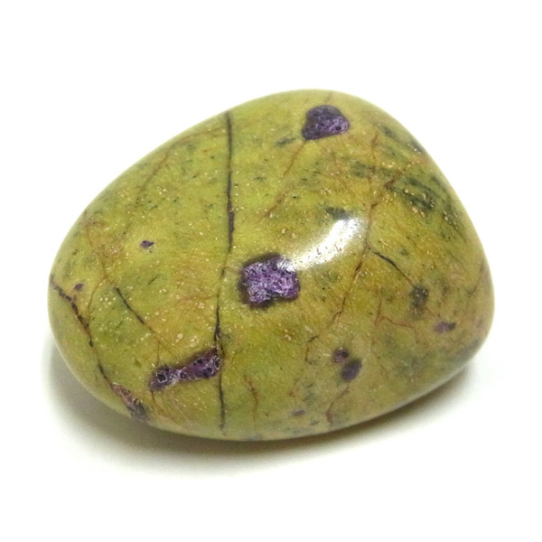 アトランティサイト、タンブルです。 鮮やかな黄緑のサーペンティン(リザーダイド)に、またまた鮮やかな紫色のスティクタイトが点々と彩りを添え、鮮やかな色彩のハーモニーが印象的です。クリスタルヒーラーのメロディ氏によって紹介されたヒーリングストーンのひとつです。産地に因んでタスマナイトとも呼ばれています。アトランティサイトの名の由来は、伝説の大国「アトランティス」から。この叡智にアクセスできるというこの奇跡のクリスタルは、ヒーリングの分野のみならず、標本業界にも多大なインパクトを与えました。大変希少性が高く近年流通量が減少しつつあるパワーストーンの一つとなります。