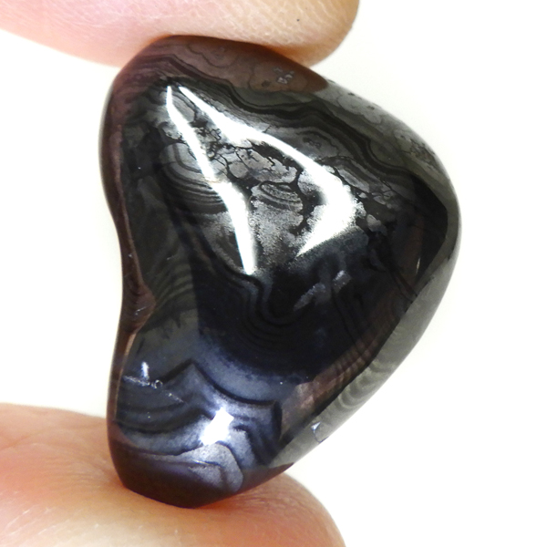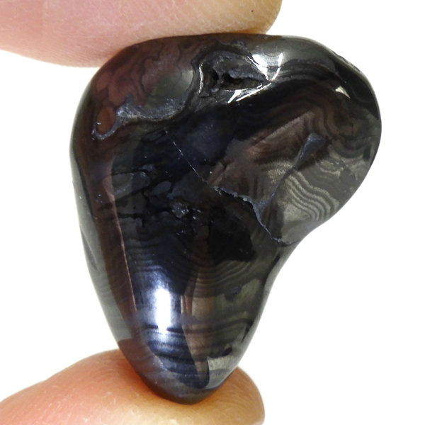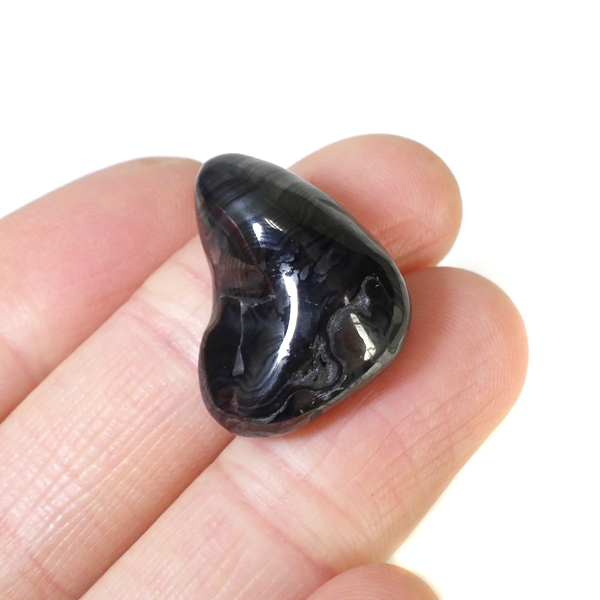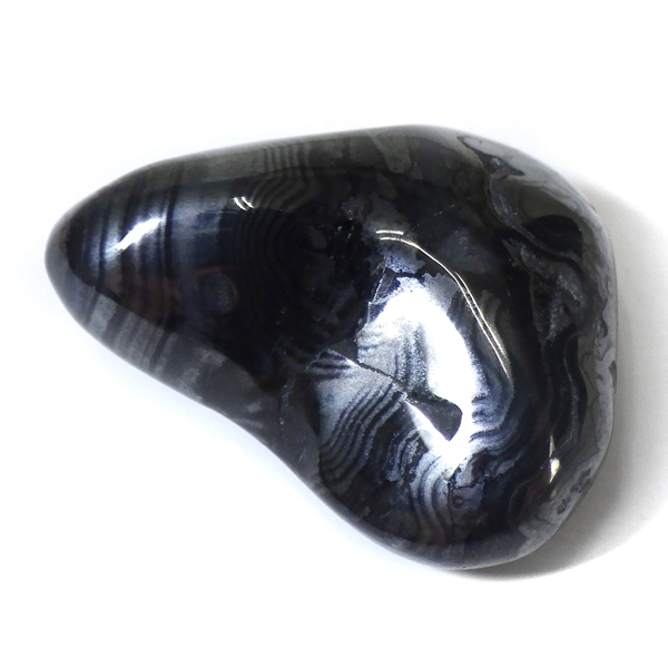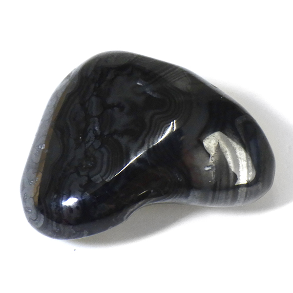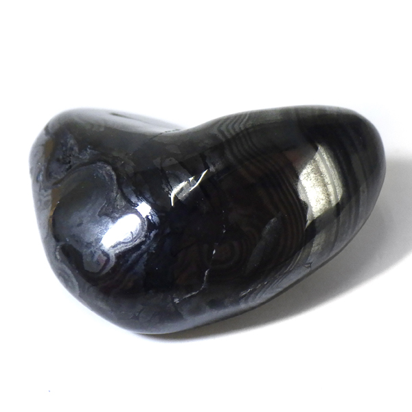 メキシコ産サイロメレーンのタンブルです。サイロメレーンはマンガンを主とした酸化鉱物でホランダイトやロマネカイトなど複数のマンガン酸化物の集合体です。黒のサイロメレーンに銀のパイロルーサイトを伴っております。和名はサイロメレーンが硬マンガン鉱、パイロルーサイトが軟マンガン鉱です。磨き上げることでメタリックな金属光沢を持つ不思議な縞模様が現れます。ヘマタイトに似ていることからリボンヘマタイトという流通名が付けられたりしておりますが、ヘマタイトにはマンガンが含まれておりませんので似て非なるものになります。