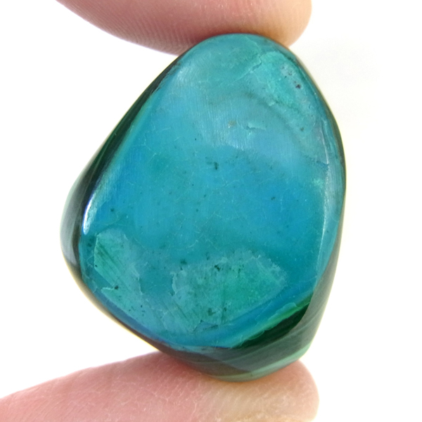 コンゴ産クリソコラマラカイト、タンブルです。クリソコラマラカイトは、その名の通り「クリソコラ」と「マラカイト」が共生した原石です。スカイブルーの部分がクリソコラ、縞模様のグリーンがマラカイトです。鮮やかなスカイブルーと深いグリーンは、まるで地球を思い起こさせてくれる美しさです。タンブルにしたことで、表面はツルツルですが、原石の名残でゴツゴツ感や凹みもあります。それぞれ趣があり、どれ一つとっても同じものはありません。また、パワーストーンとしては、クリソコラとマラカイト両方のパワーを得ることができるといわれています。