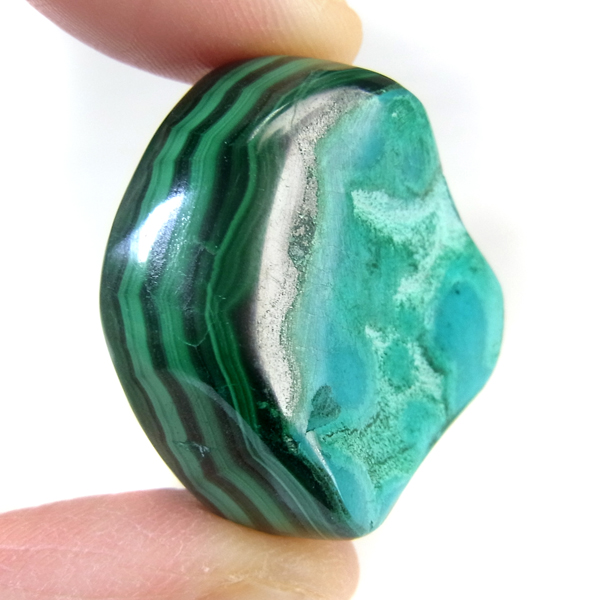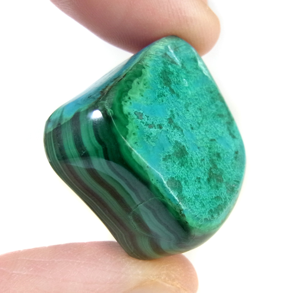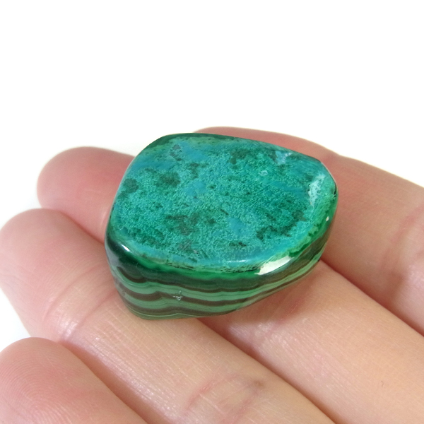 コンゴ産クリソコラマラカイト、タンブルです。クリソコラマラカイトは、その名の通り「クリソコラ」と「マラカイト」が共生した原石です。スカイブルーの部分がクリソコラ、縞模様のグリーンがマラカイトです。鮮やかなスカイブルーと深いグリーンは、まるで地球を思い起こさせてくれる美しさです。タンブルにしたことで、表面はツルツルですが、原石の名残でゴツゴツ感や凹みもあります。それぞれ趣があり、どれ一つとっても同じものはありません。また、パワーストーンとしては、クリソコラとマラカイト両方のパワーを得ることができるといわれています。