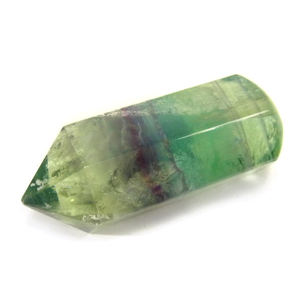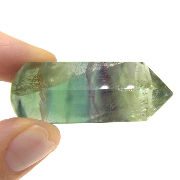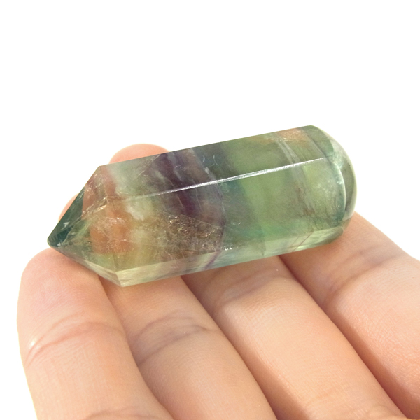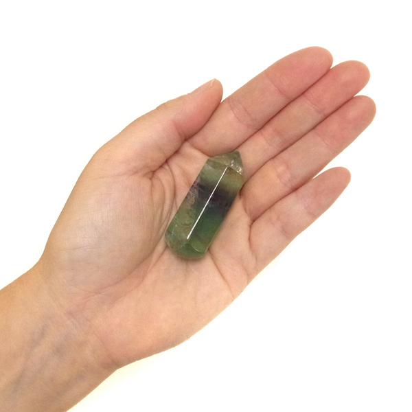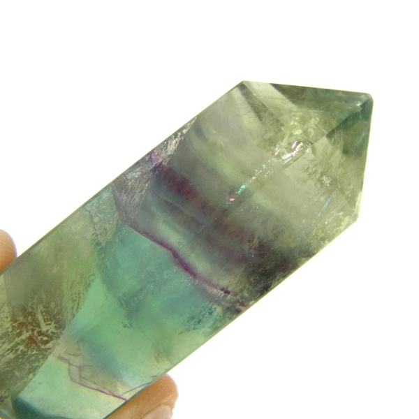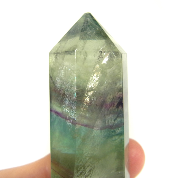 チャイナ産のフローライトポリッシュポイントです。チャイナ産のフローライトは塊状で色合いが層になって現れます。それを磨きあげることで、まこときれいなフローライトのアイテムになります。底面を丸く磨いており、手のマッサージに使うとポイントの先端から悪い気が出ていくとされています。天然鉱物とは思えないほどの絵具で色を混ぜたようなきれいな色合い。光に透かすとステンドグラスのようでより一層きれいです。