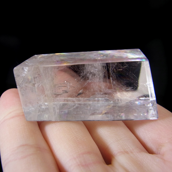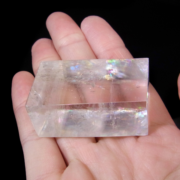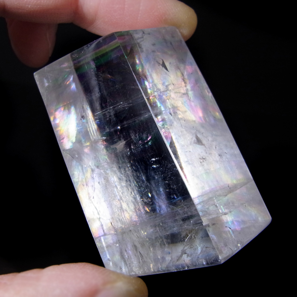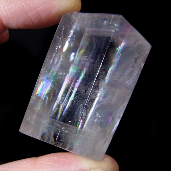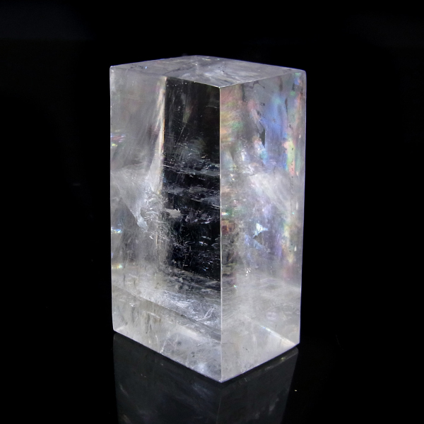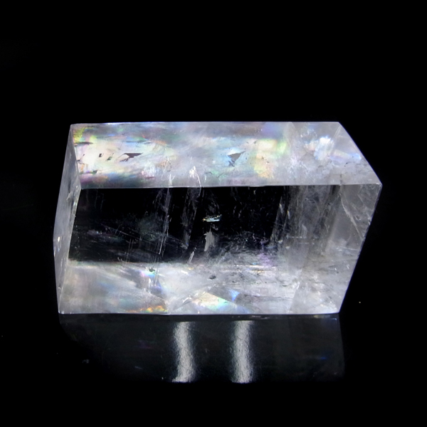 マダガスカル産のオプティカルカルサイトです。無色透明で良質のカルサイトのことをオプティカルカルサイトと呼びます。高い透明度を持ち、様々な角度からレインボーを見ることができます。複屈折という光学現象を持ち、文字の上に載せると二つにダブって見える「ダブリング(二重像現象)」のような現象を起こします。一定方向に向かって割れる劈開性によって平行四辺形の形になります。 他の産地のものよりマダガスカル産のオプティカルカルサイトはクラックが少なくきれいな印象です。