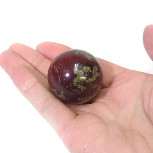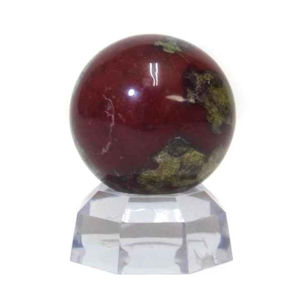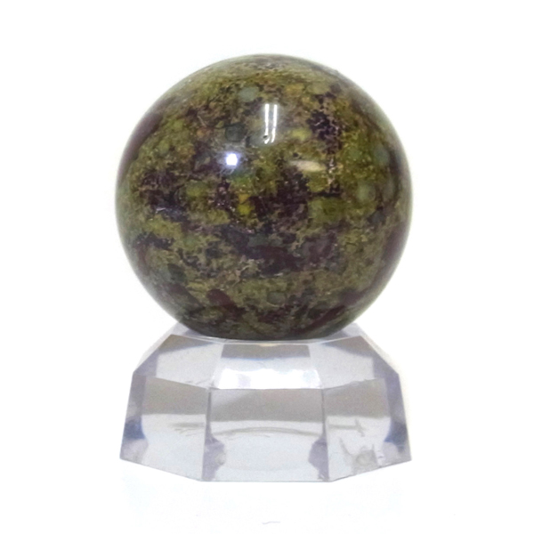 南アフリカ産のドラゴンストーン球です。原石を球状に丸く磨き上げております。ドラゴンストーンは現在では南アフリカまたはオーストラリアで産出される石のようです。ドラゴンストーンまたはドラゴンブラッドジャスパーと呼ばれます。これは、ドラゴンの皮膚を思わせる緑色に、ドラゴンの血をイメージさせる赤い点や筋が入っていることから名付けられています。日本ではあまり文献がないのですが基本はジャスパーだと思われます。こちらは磨いた球ですが、原石の状態ですとドラゴン模様の緑の石に本当にドラゴンの血が付いたのではと思わせられます。塊状で混ざりあったり模様のある原石は球状に磨き上げることで360度模様を楽しむことができます。見た目は綺麗というよりは力強くかっこいい石です。 ドラゴンストーンは勇気を奮いたさせて物事に立ち向かう、困難にくじけない強い心を持ち、忍耐力と持久力を養うといわれています。