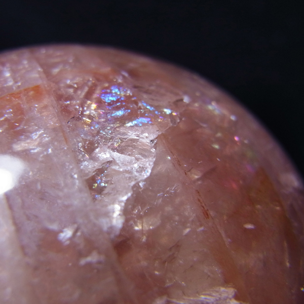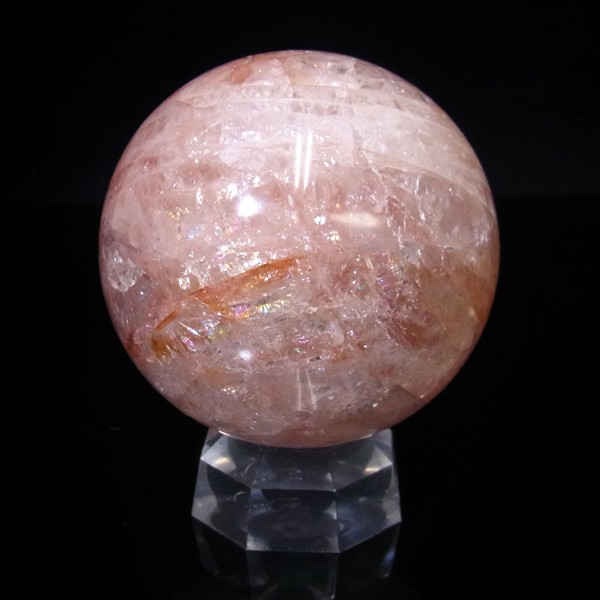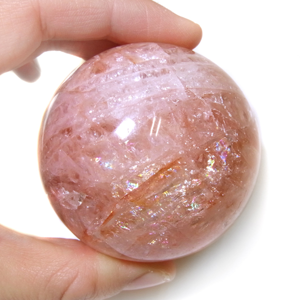 マダガスカル産のローズジラソルクォーツ球です。ジラソルクォーツは、マダガスカルで産出するミルキークォーツの総称です。クォーツ内に混入したチタンの配列により、光の干渉が特有で、スターやシラーが見られるものもあります。その含有されるチタンが酸化によりピンクを帯びると、ローズクォーツになるのですが、この石は、そのジラソルクォーツとローズクォーツの混合体に、ヘマタイト成分が混入したものです。キラキラのレインボーが表面の至る所に広範囲で見られます。淡いレッドの球も珍しくきれいです。球状の丸玉に磨いておりますのでお部屋に飾っていただいたり、手のひらに持って石に触れ合ったり自由に楽しんで頂ければと思います。