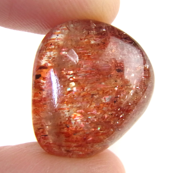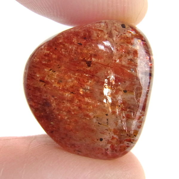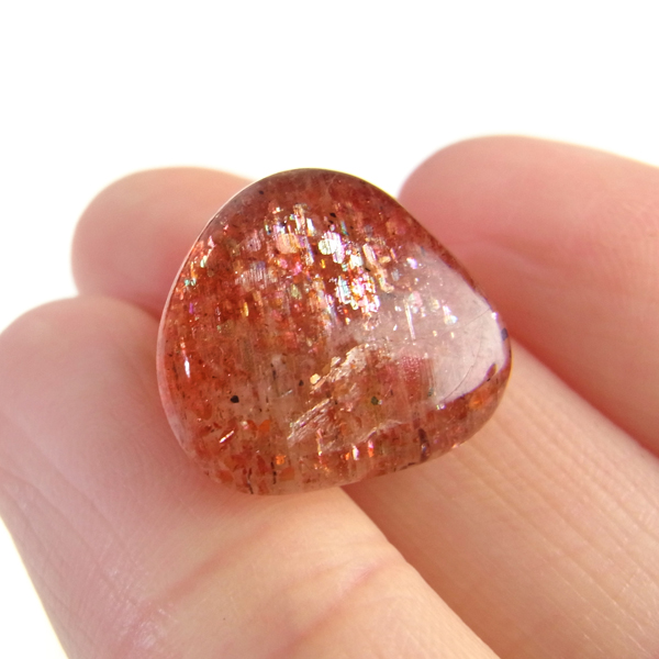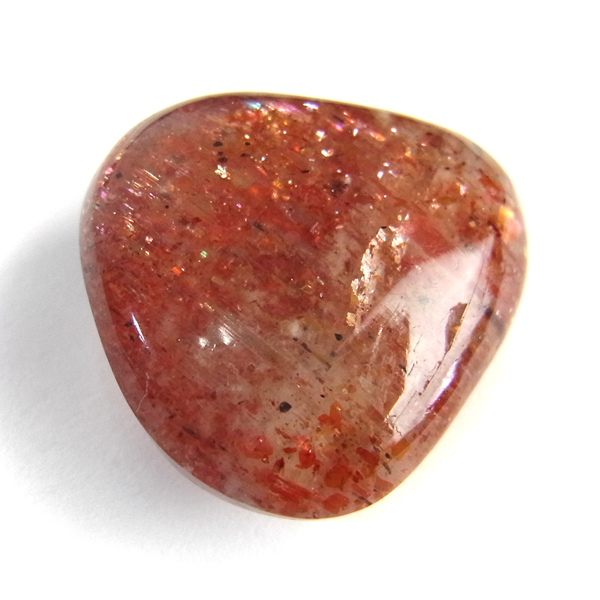 インド産のサンストーン、タンブルです。 サンストーンという名前は鉱物的な性質から名づけられ たものではなく、ムーンストーンの静かな光と対照的に思えるキラキラした光を持つことから名づけられた、宝石としての名称です。まさに太陽のようなキラキラした石です。