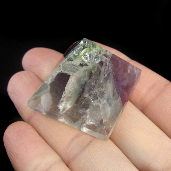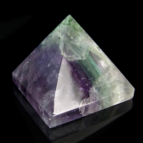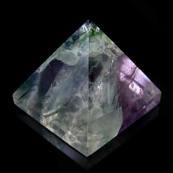 チャイナ産のフローライトをピラミッド型に研磨したアイテムです。澄んだクリアなフローライトで内部の結晶まで見ることができ、とてもきれいで癒されます。複雑な色彩が神秘的で面白い表情を見せてくれます。 ピラミッド型は宇宙と深い関係があるとされる形です。心身のバランスの安定をはかり、潜在能力を高めてくれます。先端は宇宙のエネルギーを集めているといわれています。