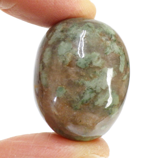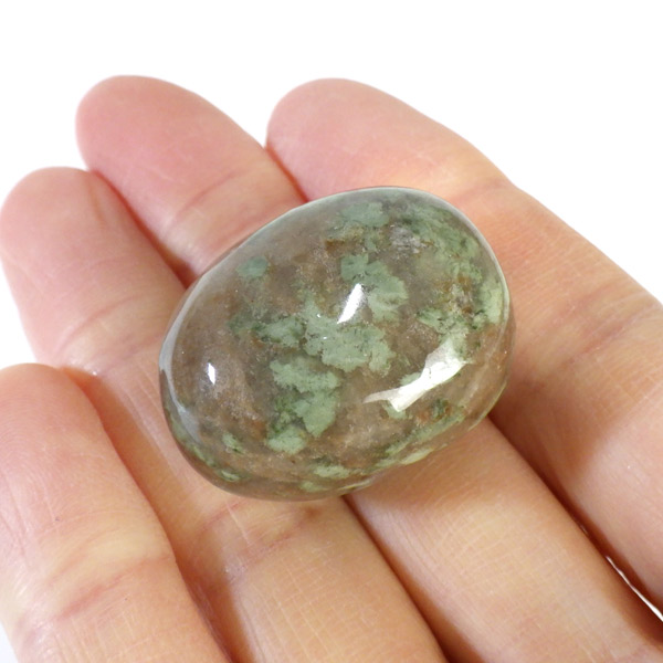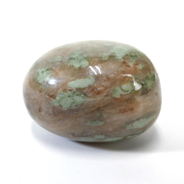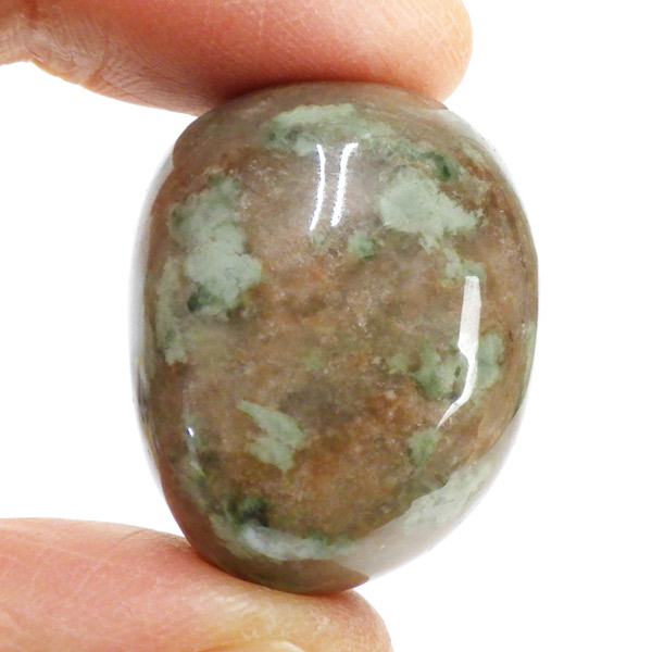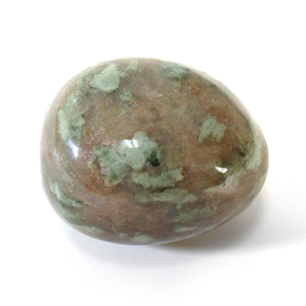 オーストラリア産のナンドライト、タンブルです。ナンドライトはオーストラリア・ニューサウスウェールズ州の小さな町ナンドルが産地である、希少であまり知られていない岩石です。ナンドライトという名前は、この産地に由来しています。ナンドライトの本質的な分類はエジリン閃長岩(エジリン・サイアナイト)にあたります。茶色やベージュ系のサイアナイト母岩の中に、深いグリーンのエジリンがドット状に散りばめられており、その独特な模様と色合いが非常に魅力的です。