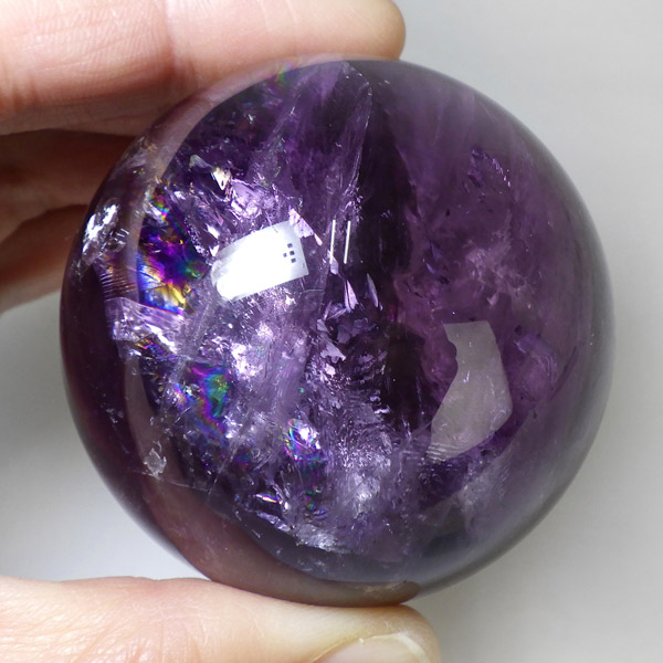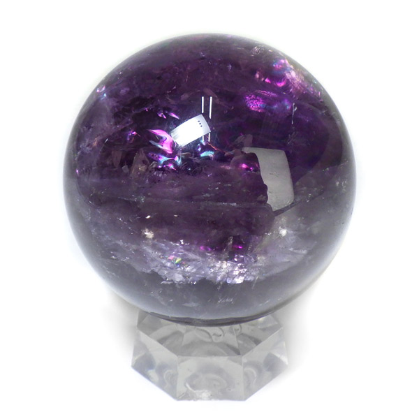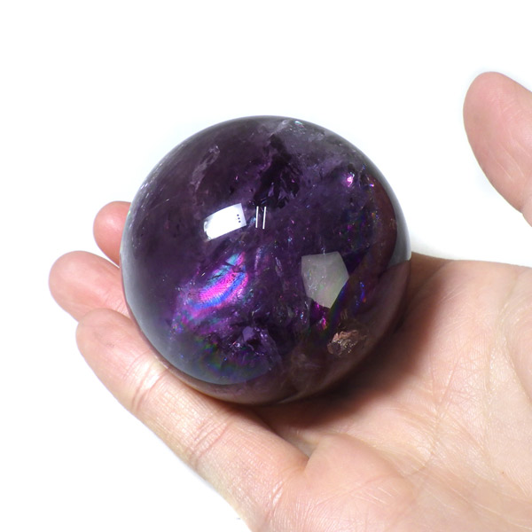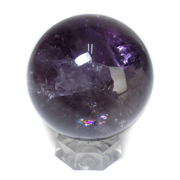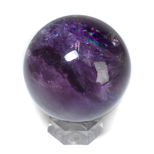 ブラジル産の高品質のアメジスト球です。素晴らしい透明度を持ったアメジストで色はほぼ均一の濃い紫。内部の鏡面による流れるように現れるレインボーが一番の見どころポイントです。透明度が高いのでいろんな表情が見られます。58mmと野球ボールほどの大きさがあります。光に透かして見たり、くるくると回してみたり、お気に入りの場所に飾ってみたり、実際に手に取って楽しんでいただきたい一点です。