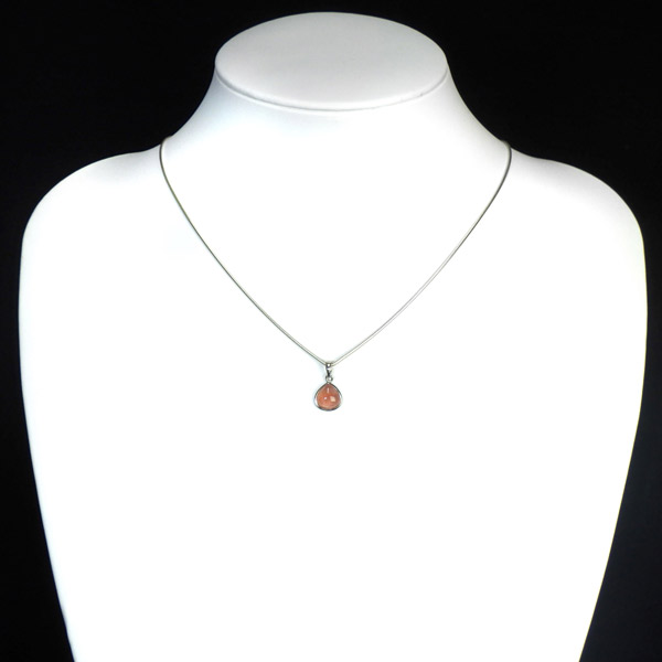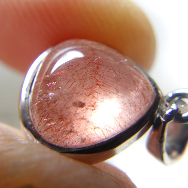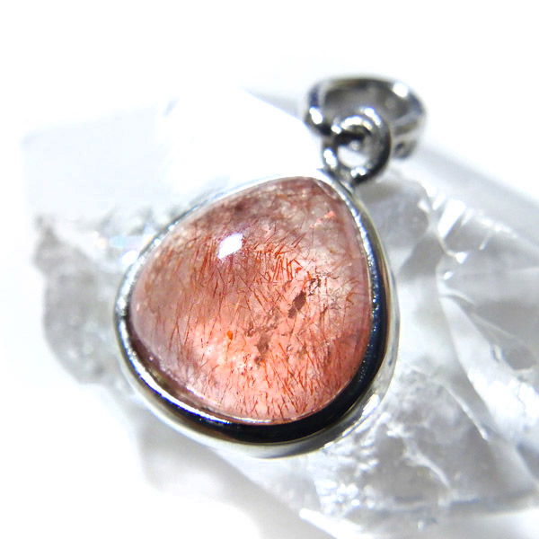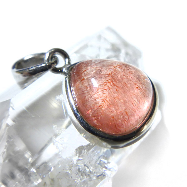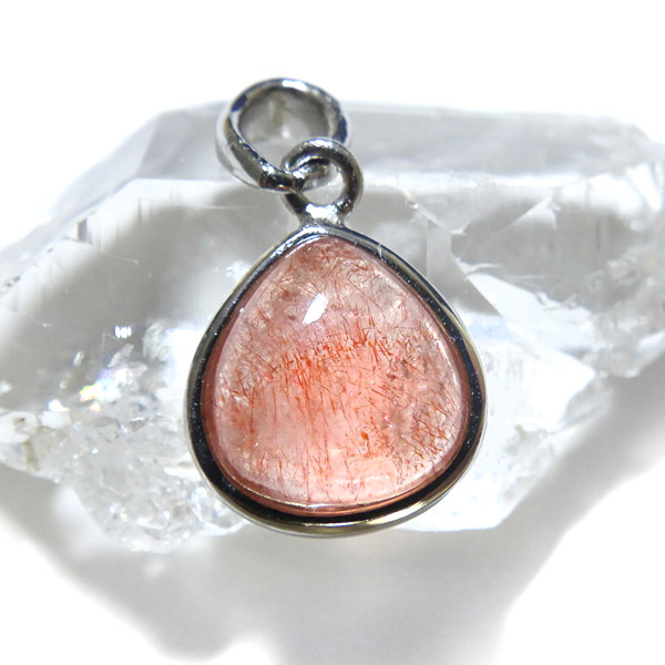カザフスタン産ストロベリークォーツのペンダントトップです。ストロベリークォーツは優しい色合いのピンクでレピドクロサイトまたはゲーサイトがインクリュージョンされた水晶のことです。赤い針状の結晶がびっしりと水晶内に内包されています。透明度が高く、石自体の煌めきと内包物の輝きが合わさってとても魅力的です。とてもかわいいペンダントトップです。