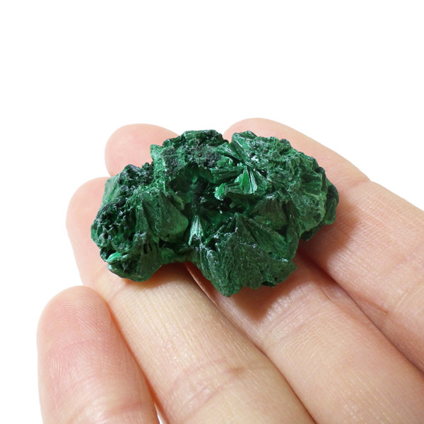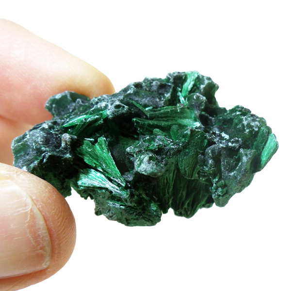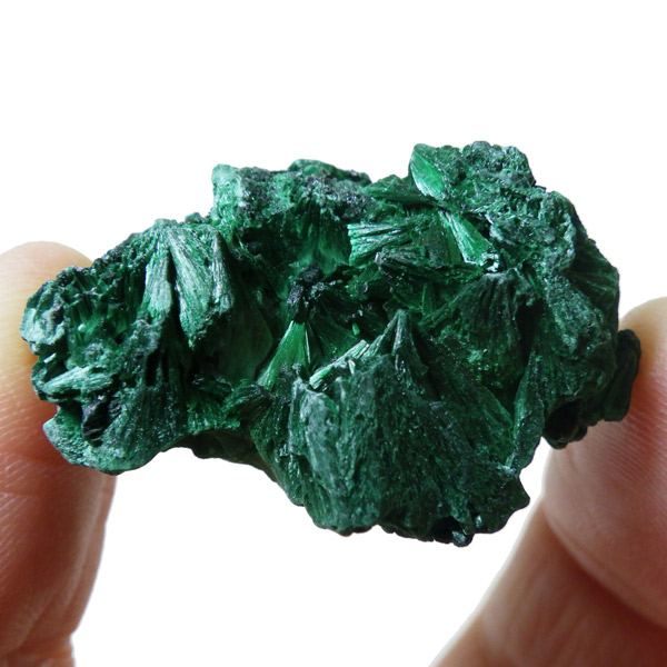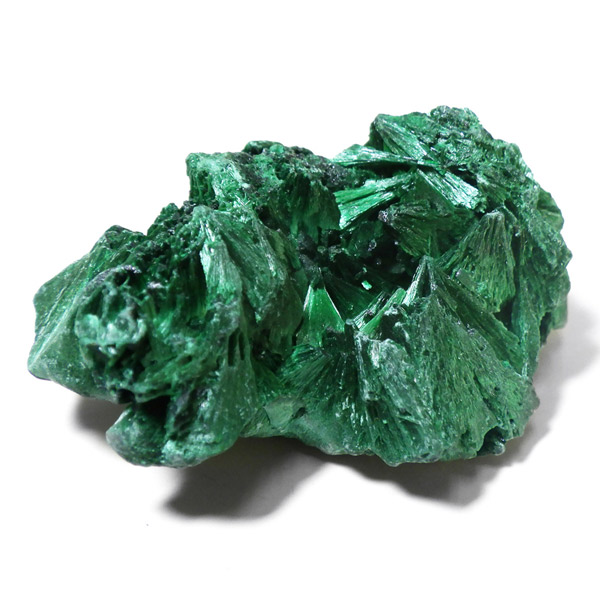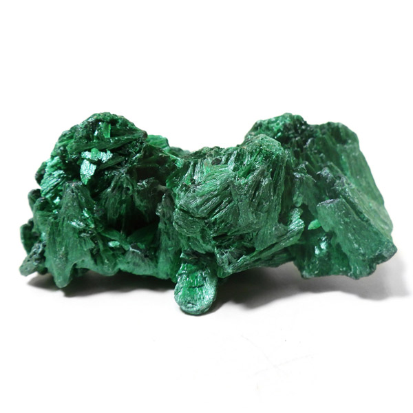 コンゴ産のマラカイト原石です。繊維状の結晶が集まった美しい一品で、ベルベットのような光沢があります。艶やかに光るきれいなグリーンで、一見脆そうに見えますが触ってみるとしっかりした結晶です。