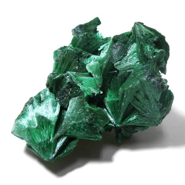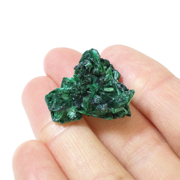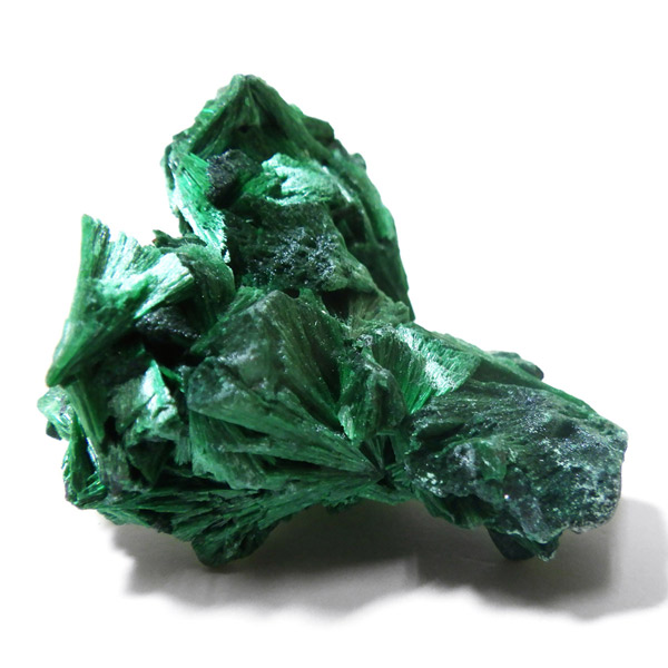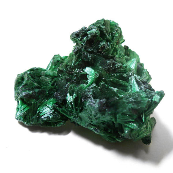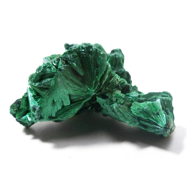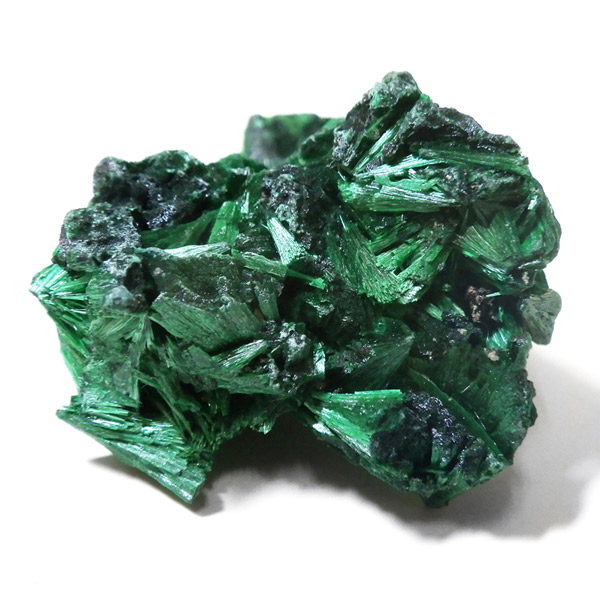 コンゴ産のマラカイト原石です。繊維状の結晶が集まった美しい一品で、ベルベットのような光沢があります。艶やかに光るきれいなグリーンで、一見脆そうに見えますが触ってみるとしっかりした結晶です。