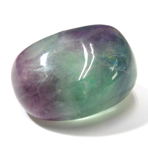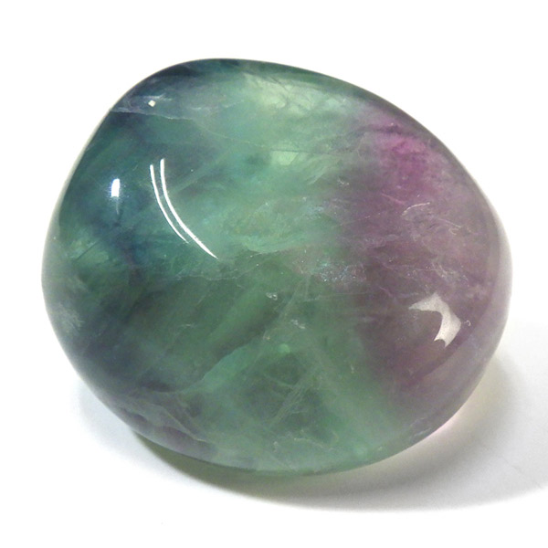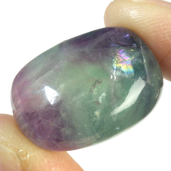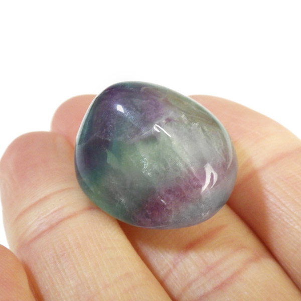 チャイナ産フローライトのタンブルです。 大変透明度が高く、いろいろなカラーの色彩が見られます。蛍石の名前の通り、様々な角度からその美しさを楽しむことができます。光にかざして透かすと、カラーが複雑に入り乱れており、そのグラデーションが大変きれいです。透明度が高く、レインボーが見られます。