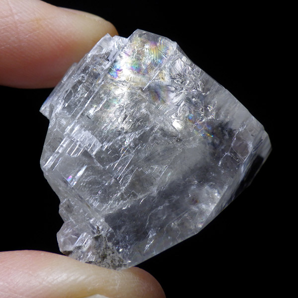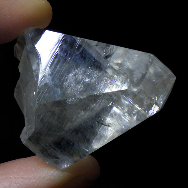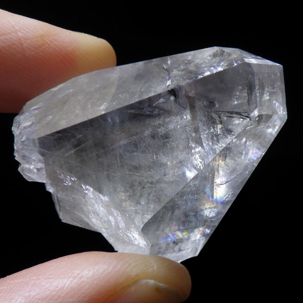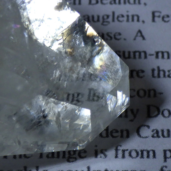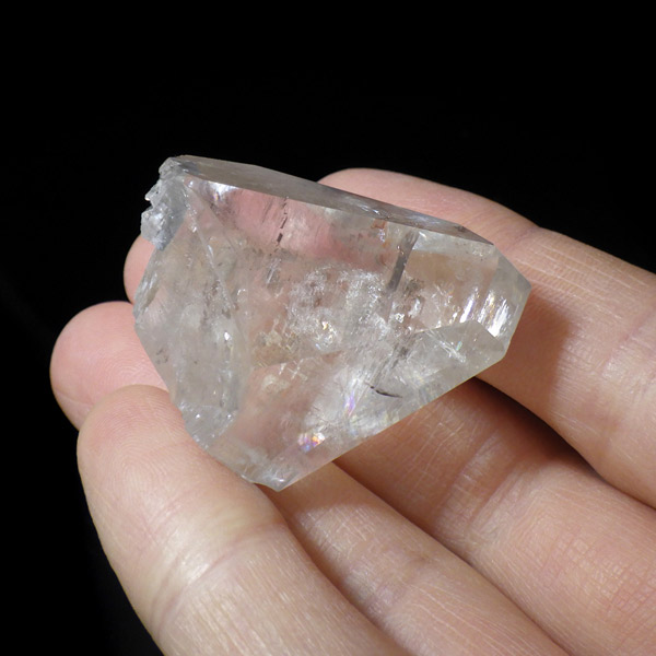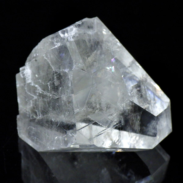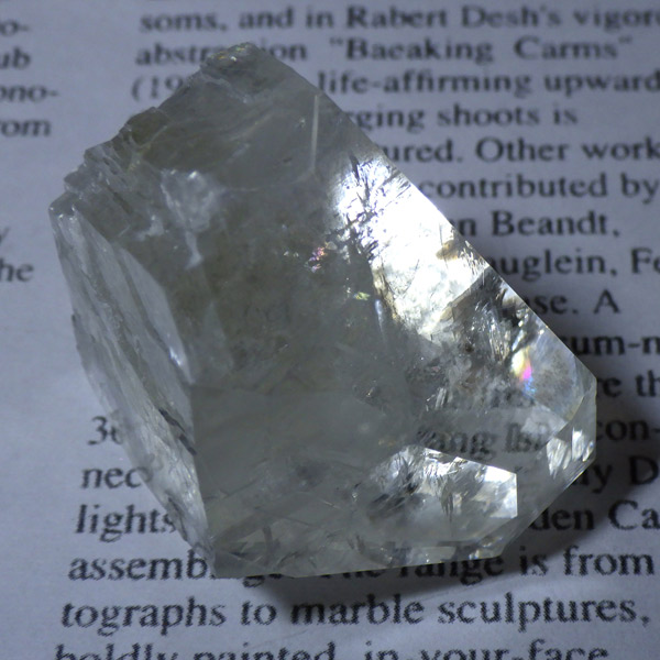 アメリカ・アイオワ州産のカルサイトです。高い透明度を持ち、様々な角度からレインボーを見ることができます。複屈折という光学現象を持ち、文字の上に載せると二つにダブって見える「ダブリング(二重像現象)」のような現象を起こします。 カルサイトは炭酸カルシウムを主成分とするため、水に弱く、長時間水にさらしていると輝きが無くなってしまうので注意が必要です。