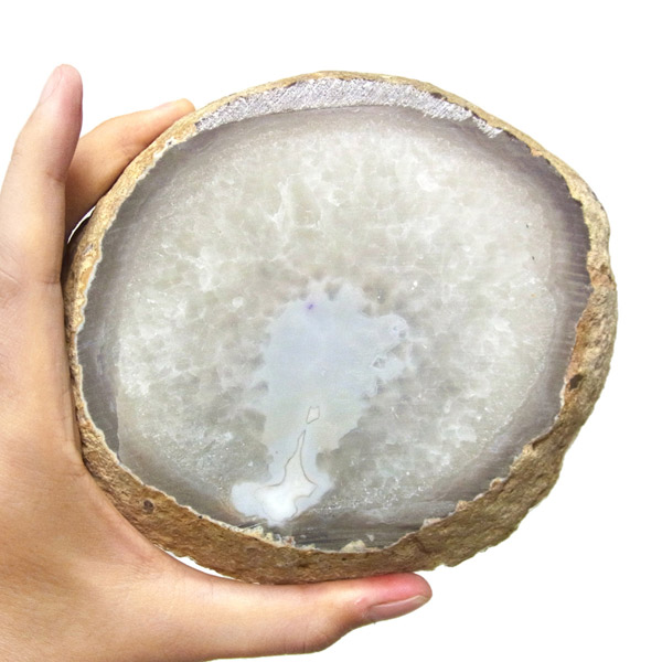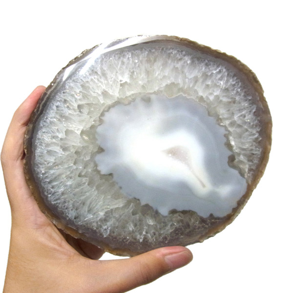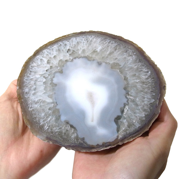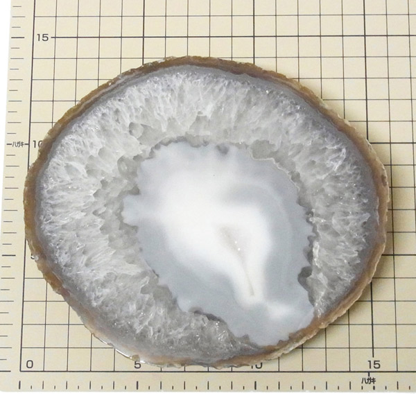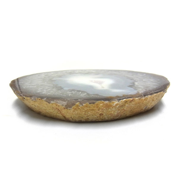 ブラジル産メノウのノジュール(塊)を真ん中でカットし、スライスした断面を研磨した厚切りメノウスライス原石です。メノウは英語でアゲートと呼びます。染色を施していないナチュラルカラーのメノウで縞模様が美しいです。