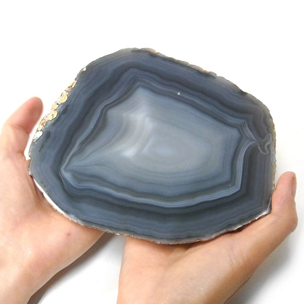 ブラジル産メノウのノジュール(塊)を真ん中でカットし、スライスした断面を研磨した厚切りメノウスライス原石です。メノウは英語でアゲートと呼びます。染色を施していないナチュラルカラーのメノウで縞模様が美しいです。