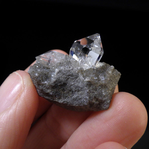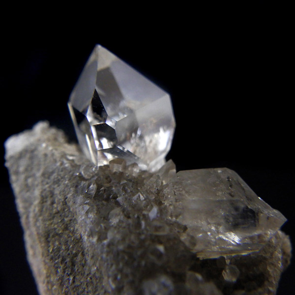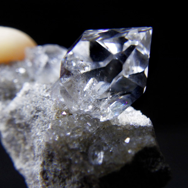 このハーキマーダイヤモンドにはとても小さいですが、結晶面がひし形のウインドウが2か所確認出来ました。結晶自体が2つあるのも魅力的です。結晶内にはレインボーも見え幻想的な雰囲気を持っています。