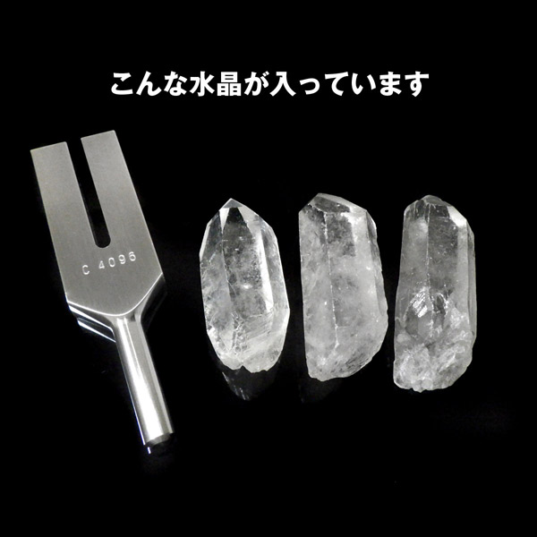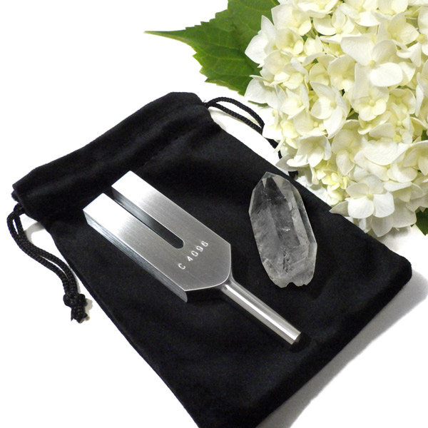 このクリスタルヒーリングチューナーは毎秒4096Hzという高周波を発するように調律されています。地球の基本振動は8Hz、この振動を倍増していき9オクターブ上昇した振動数が4096Hzで、天と地を結ぶ「天使の扉」を開く音域と言われています。専用ポーチ、水晶1つ、クリスタルチューナーの3点セットです。