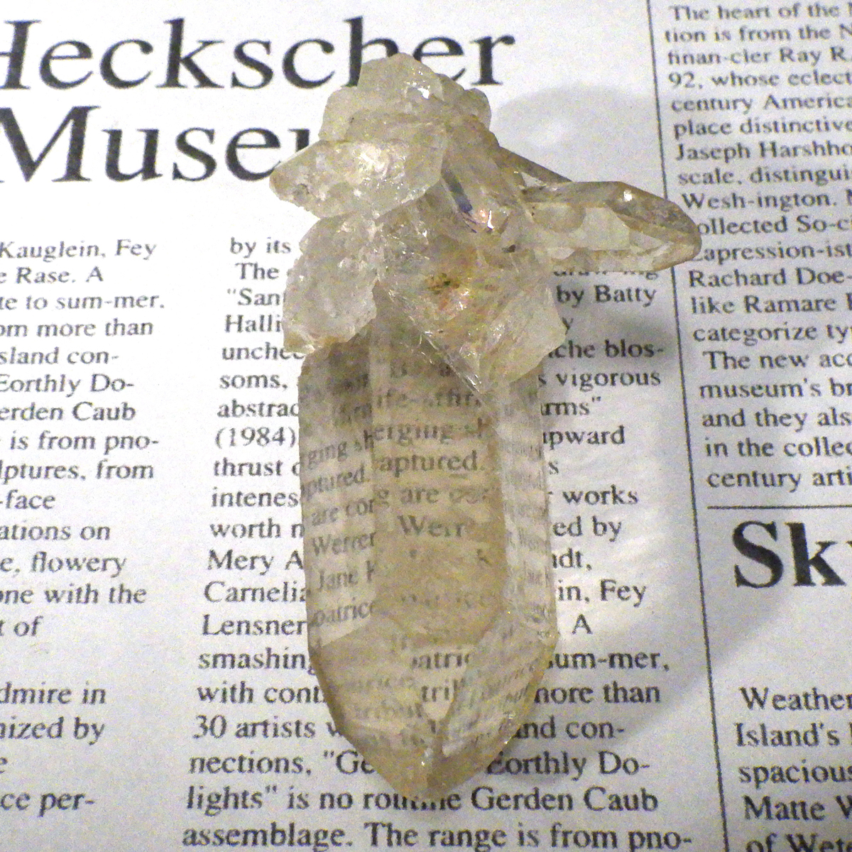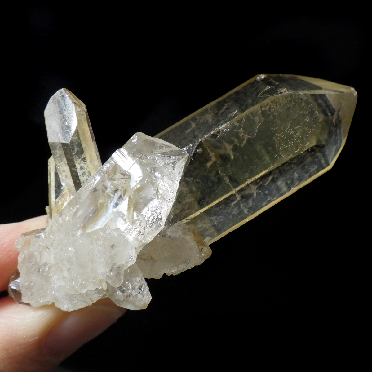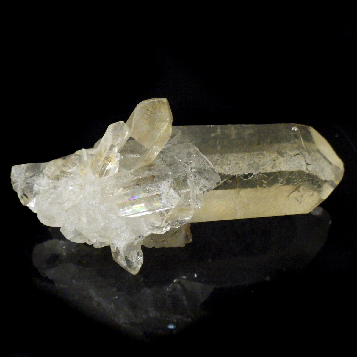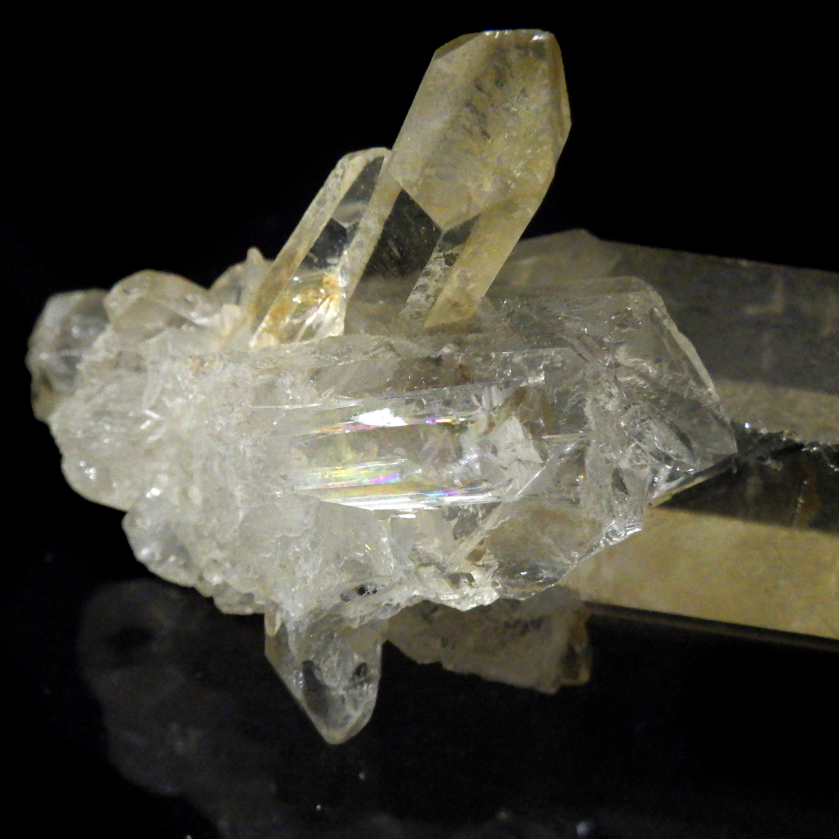 ブラジル・ミナスジェライス産のゴールデンタンジェリンクォーツ、クラスターです。優しいゴールド色に色づいた美しい水晶です。この金色は水晶の表面にヘマタイト成分が付着し、それが酸化してできます。表面は美しい金色ですが中身は透明な水晶です。透明度が高く、はっきりとしたレインボーが確認できます。