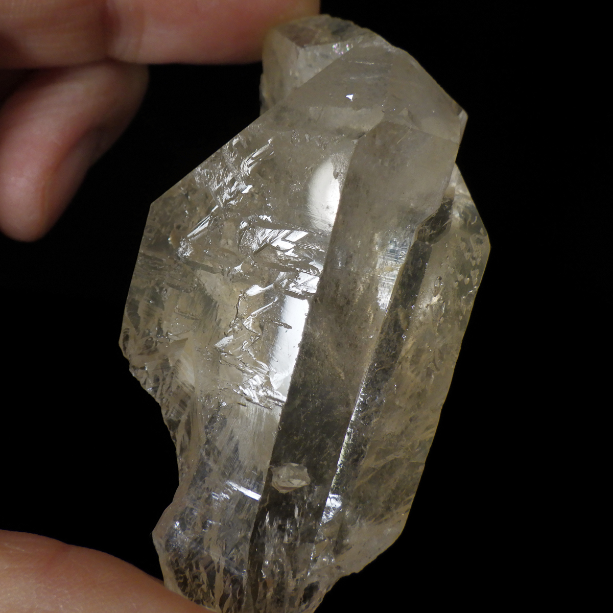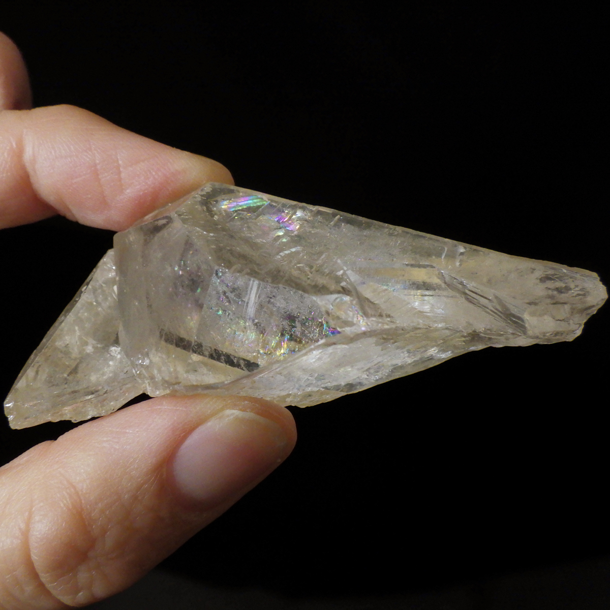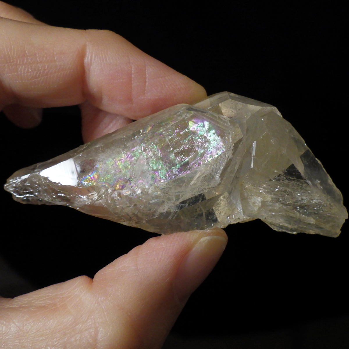 ブラジル・ミナスジェライス産のゴールデンタンジェリンクォーツです。優しいゴールド色に色づいた美しい水晶です。この金色は水晶の表面にヘマタイト成分が付着し、それが酸化してできます。表面は美しい金色ですが中身は透明な水晶です。透明度が高く、広範囲にわたってレインボーが確認できます。