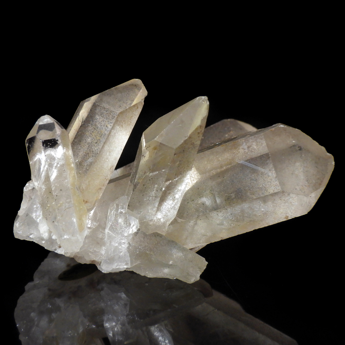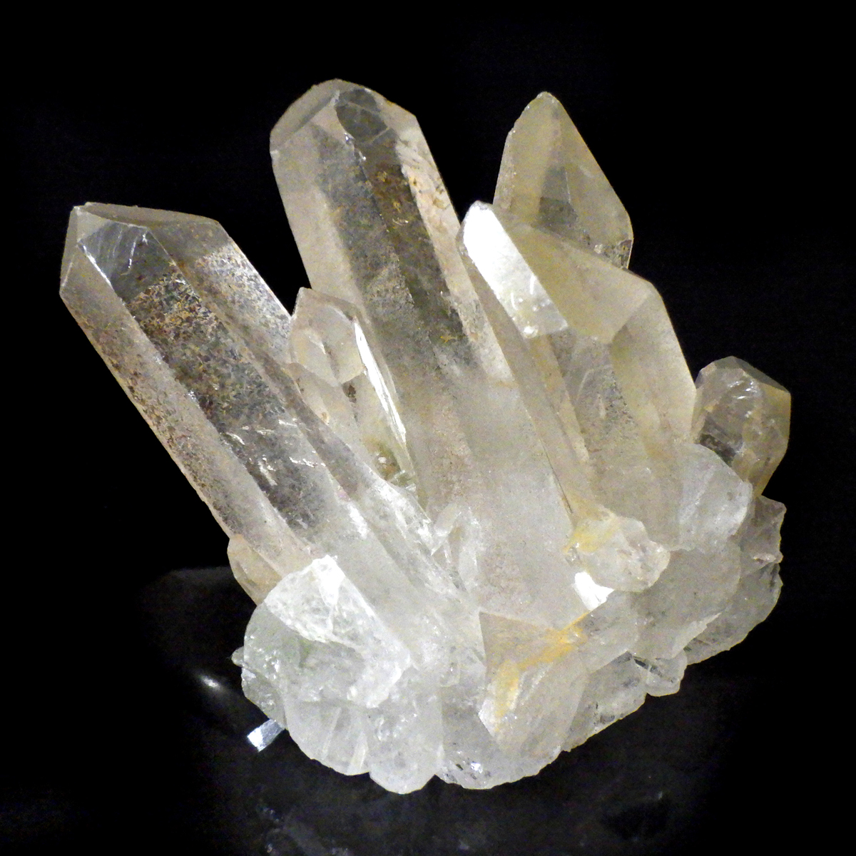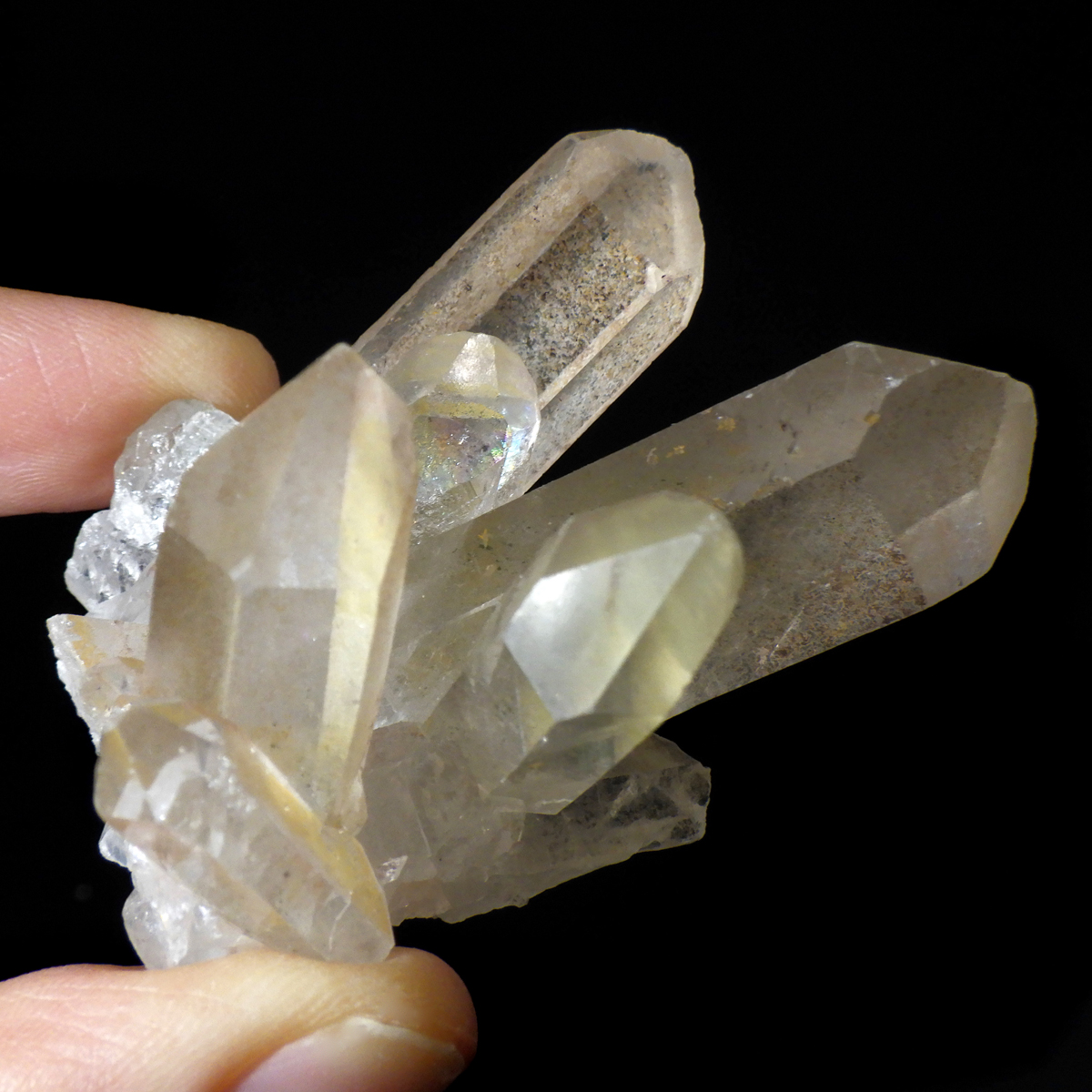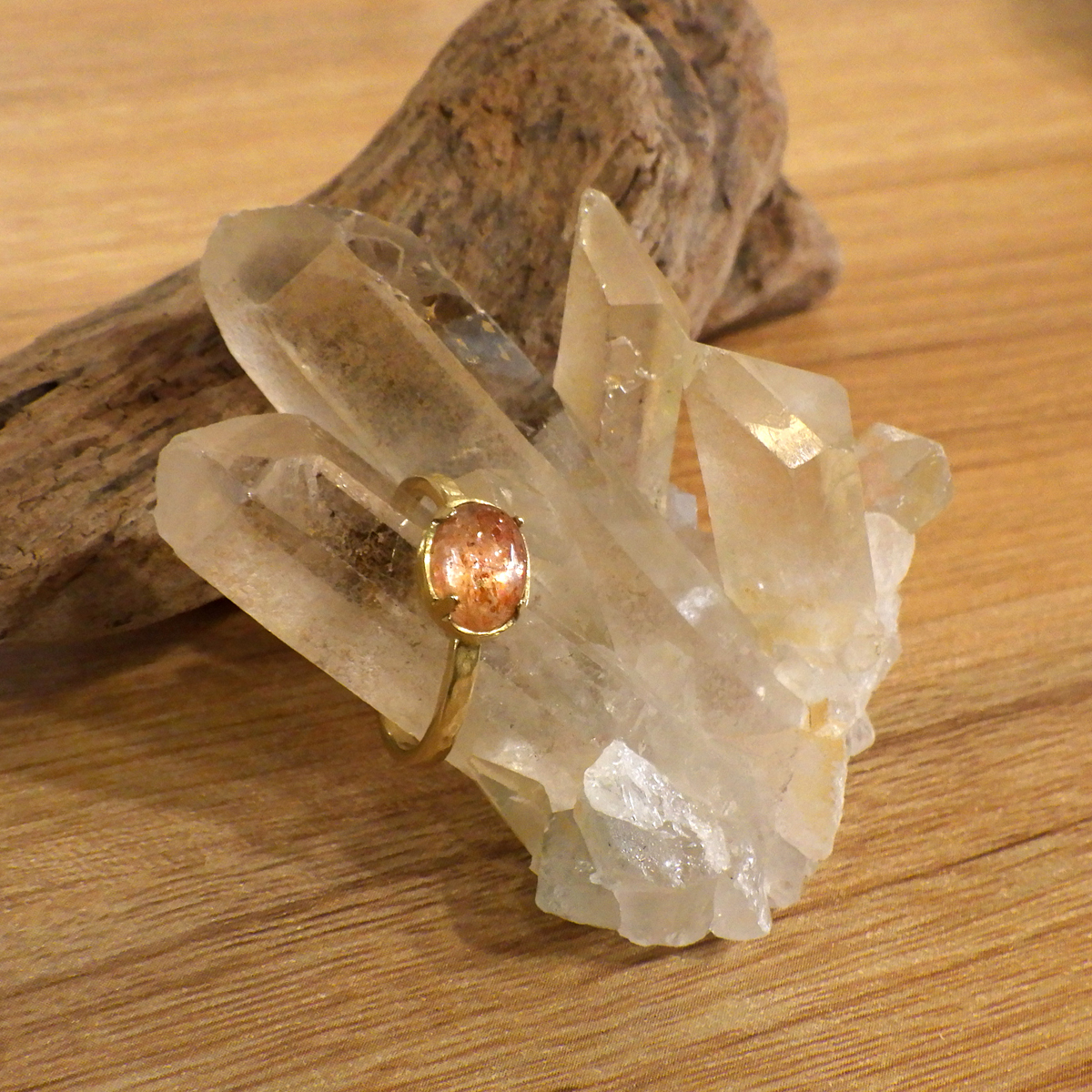 ブラジル・ミナスジェライス産のゴールデンタンジェリンクォーツ、クラスターです。優しいゴールド色に色づいた美しい水晶です。この金色は水晶の表面にヘマタイト成分が付着し、それが酸化してできます。表面は美しい金色ですが中身は透明な水晶です。はっきりとしたレインボーと小さなウインドウが確認できます。