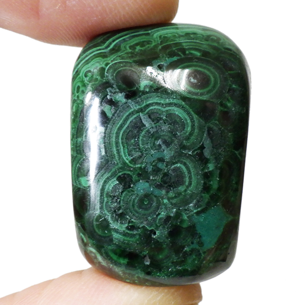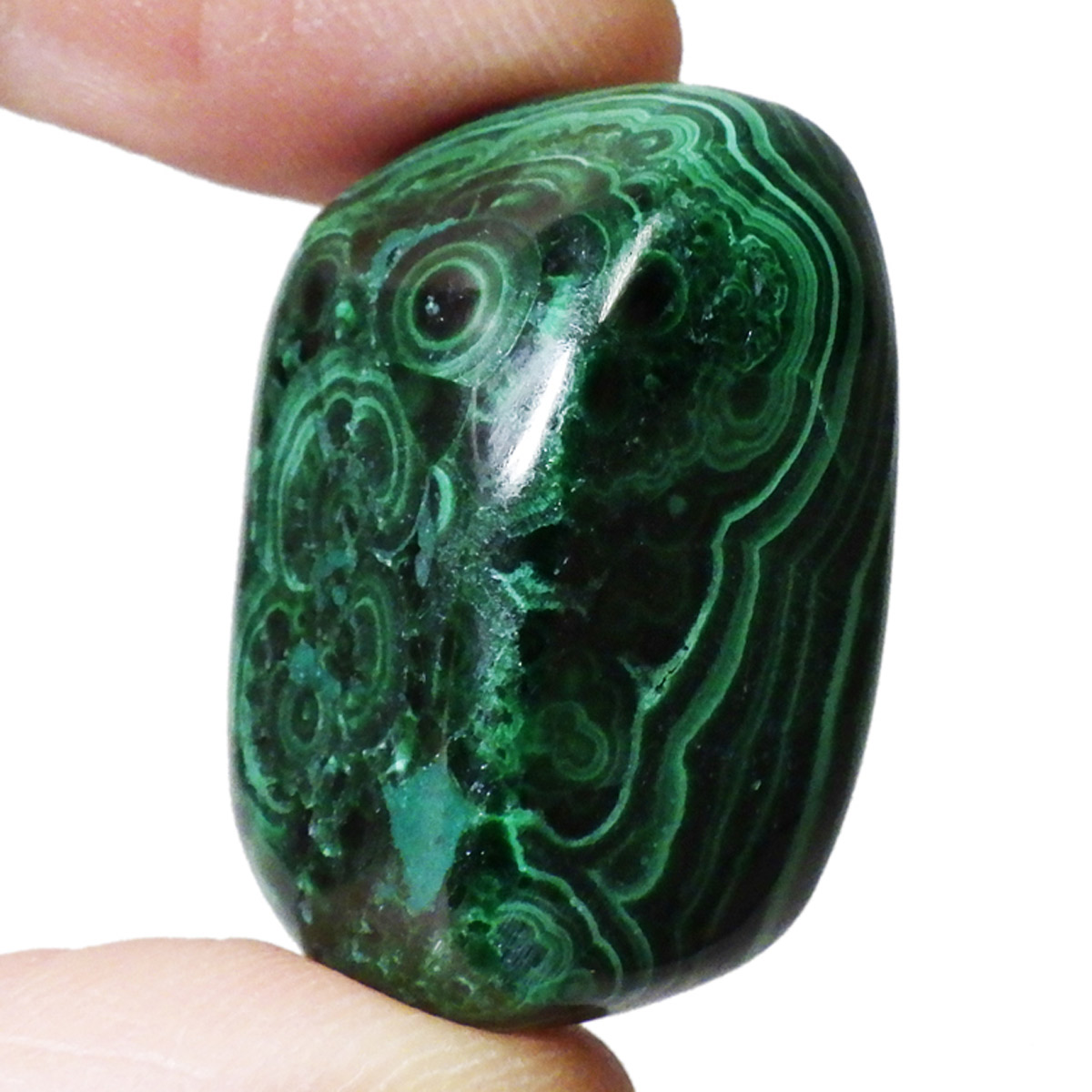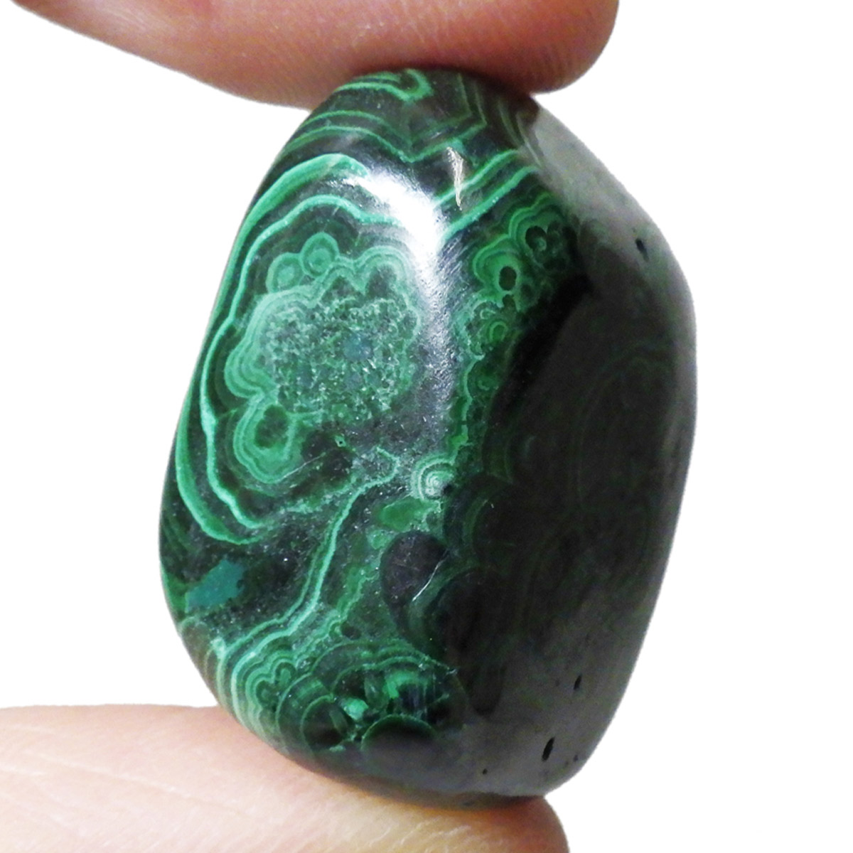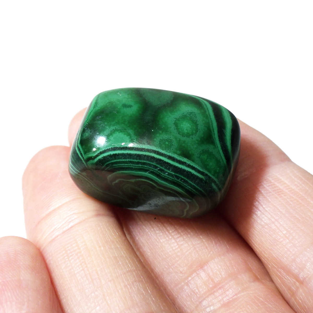 コンゴ産のマラカイト、タンブルです。濃いグリーンカラーに独特の模様を持つマラカイト。 「マラカイトグリーン」という色名になっているほど、特徴的で美しい緑色です。 マラカイトの産地はアメリカ・ロシア・コンゴ・ザンビアなどですが、中でもコンゴ産のマラカイトは非常に美しいものが採れるため、コレクターからも支持されています。
