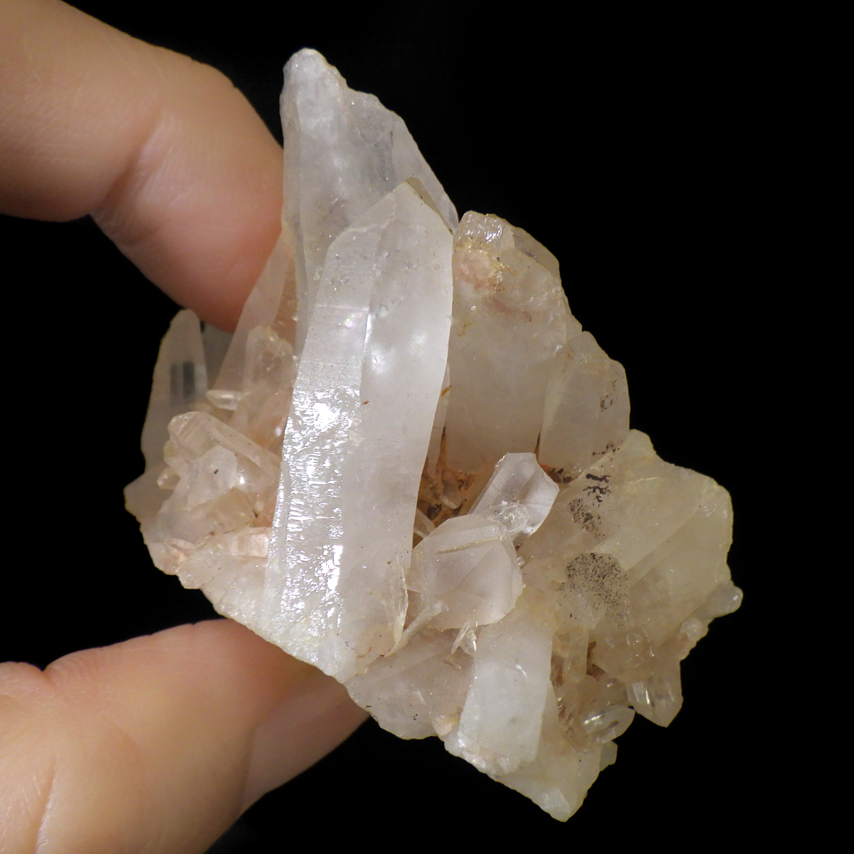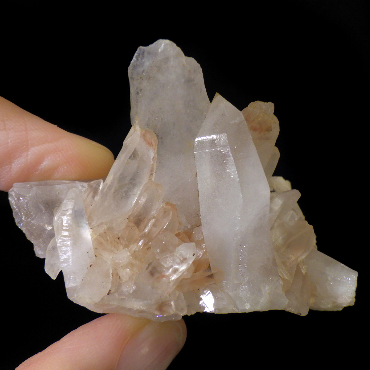 インド・ヒマラヤ山脈にあるパールバティー渓谷産の水晶クラスターです。この地で採掘される水晶には表面がピンク、又はグリーンをしたものがよく見られます。ピンク色の水晶といえばローズクォーツが有名ですが、それとは別で土壌に含まれる赤褐色をした酸化鉄により表面や母岩部がピンク色になっています。ほんのりと淡いピンク色や濃いピンク色、オレンジがかったピンク色などそれぞれ微妙に色合いも違います。グリーンはクローライトを内包したものになります。