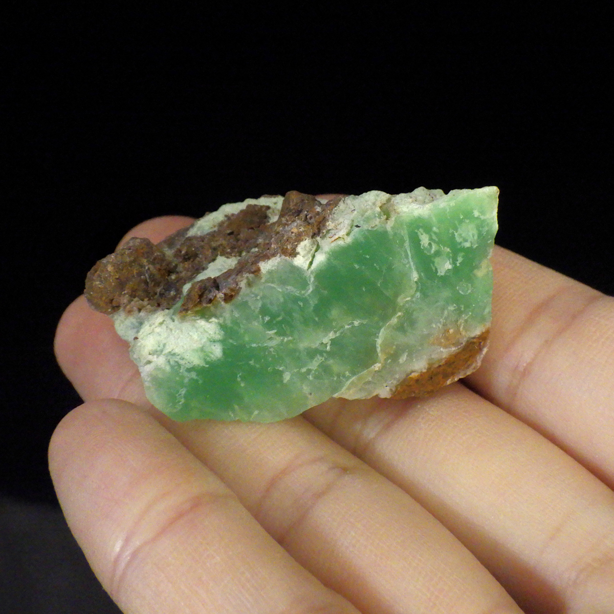 オーストラリア産のクリソプレーズ、ポリッシュ仕上げです。 和名を「緑玉髄」といいます。カルセドニーの一種で、黄緑色や薄緑色のものをクリソプレーズと言います。産出量がとても少ない為カルセドニーの中で最も価値が高い石とされており、その鮮やかな色から「アップルグリーン」と呼ばれ親しまれてきました。生成は珪酸溶液中にニッケルを含む鉱物が混入し、コロイド状になって固まってできると言われています。太陽光に長時間当てると退色する恐れがあるので注意が必要です。
