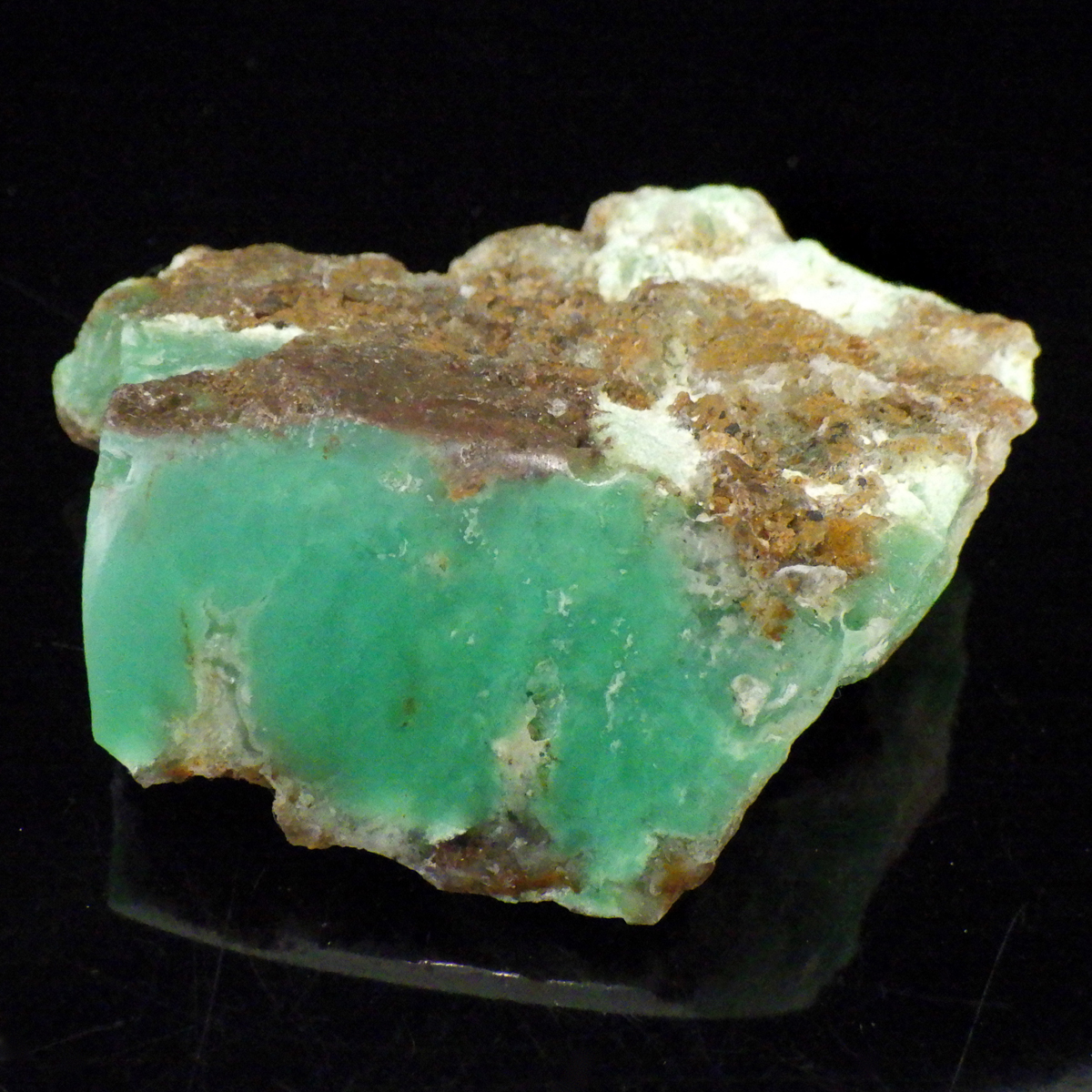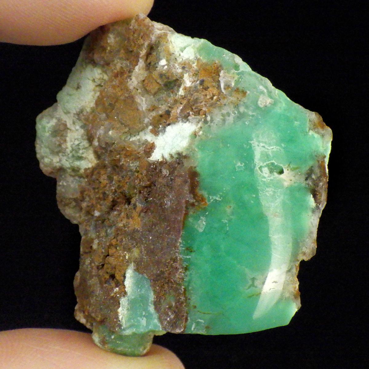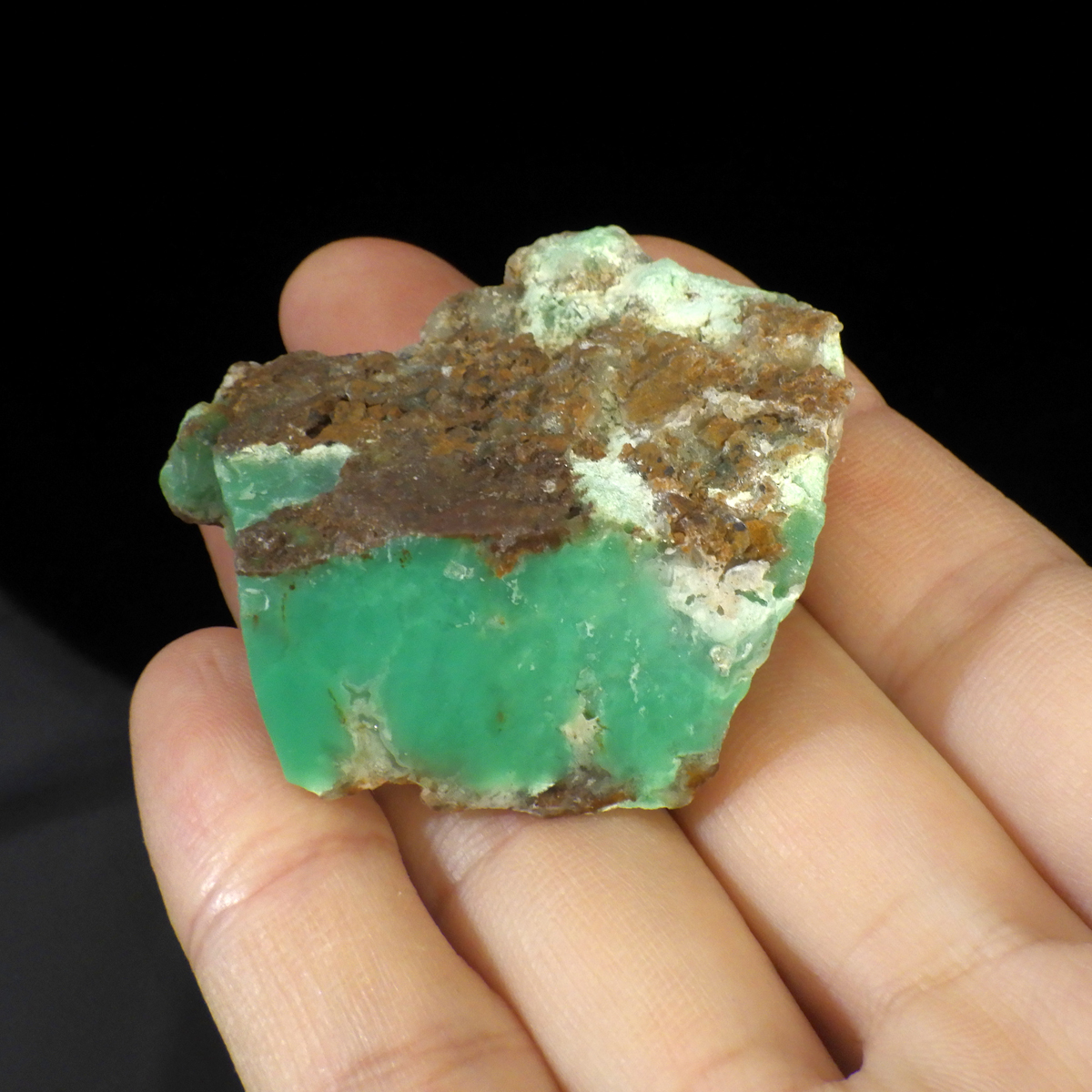 オーストラリア産のクリソプレーズ、ポリッシュ仕上げです。 和名を「緑玉髄」といいます。カルセドニーの一種で、黄緑色や薄緑色のものをクリソプレーズと言います。産出量がとても少ない為カルセドニーの中で最も価値が高い石とされており、その鮮やかな色から「アップルグリーン」と呼ばれ親しまれてきました。生成は珪酸溶液中にニッケルを含む鉱物が混入し、コロイド状になって固まってできると言われています。太陽光に長時間当てると退色する恐れがあるので注意が必要です。