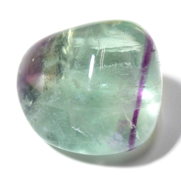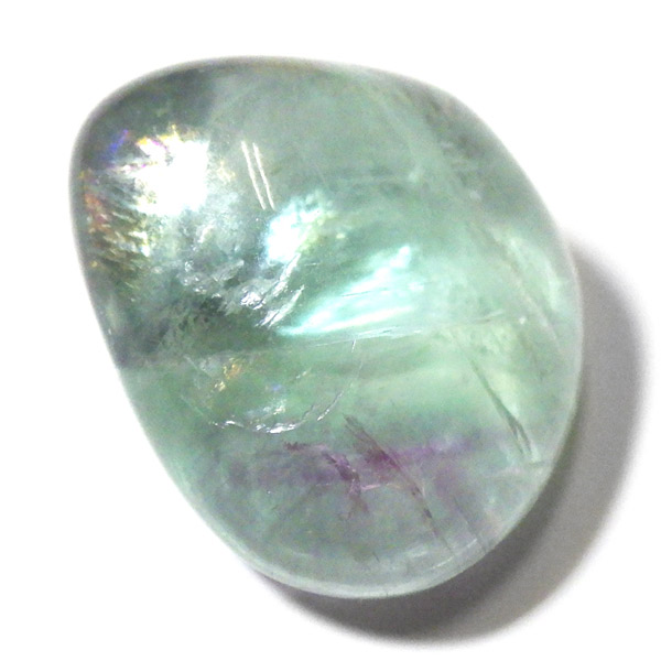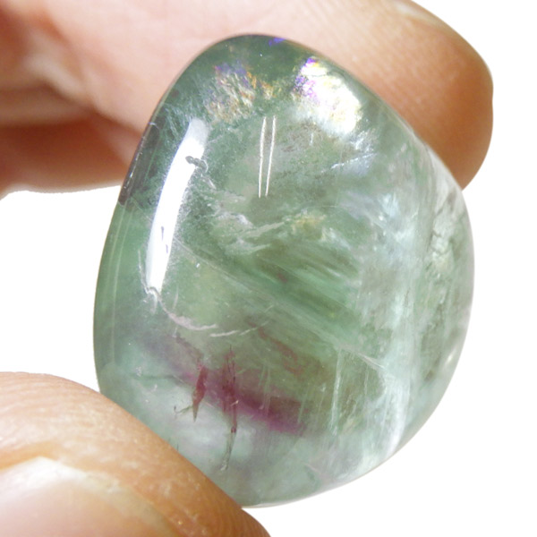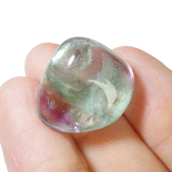 チャイナ産フローライトのタンブルです。 大変透明度が高く、いろいろなカラーの色彩が見られます。蛍石の名前の通り、様々な角度からその美しさを楽しむことができます。光にかざして透かすと、カラーが複雑に入り乱れており、そのグラデーションが大変きれいです。透明度が高く、レインボーが見られます。