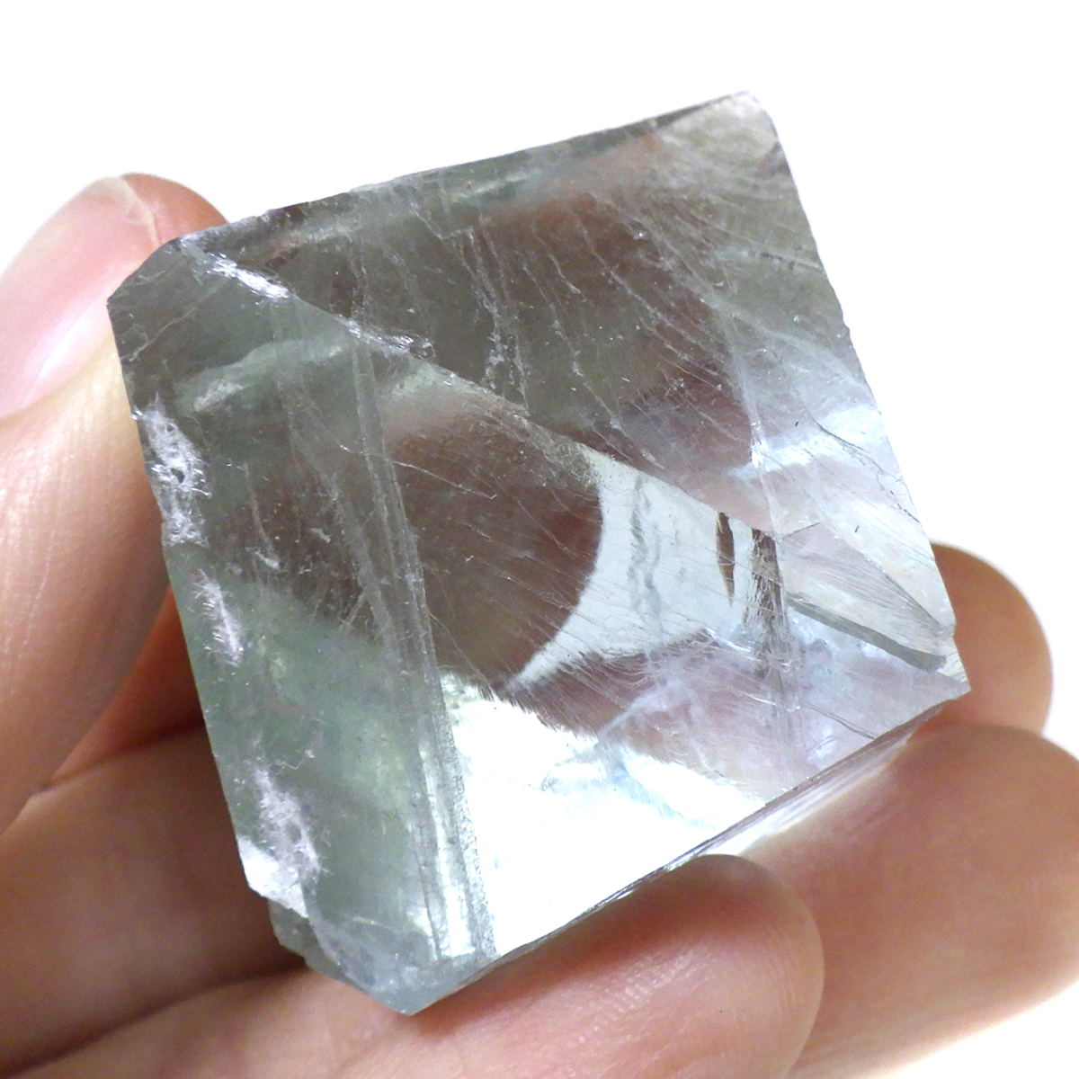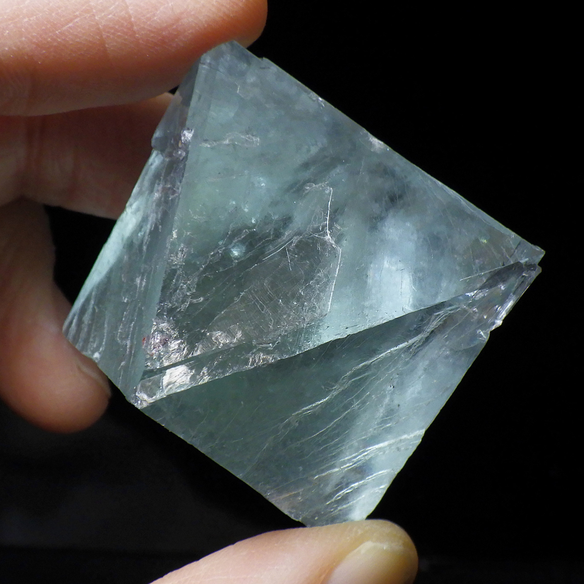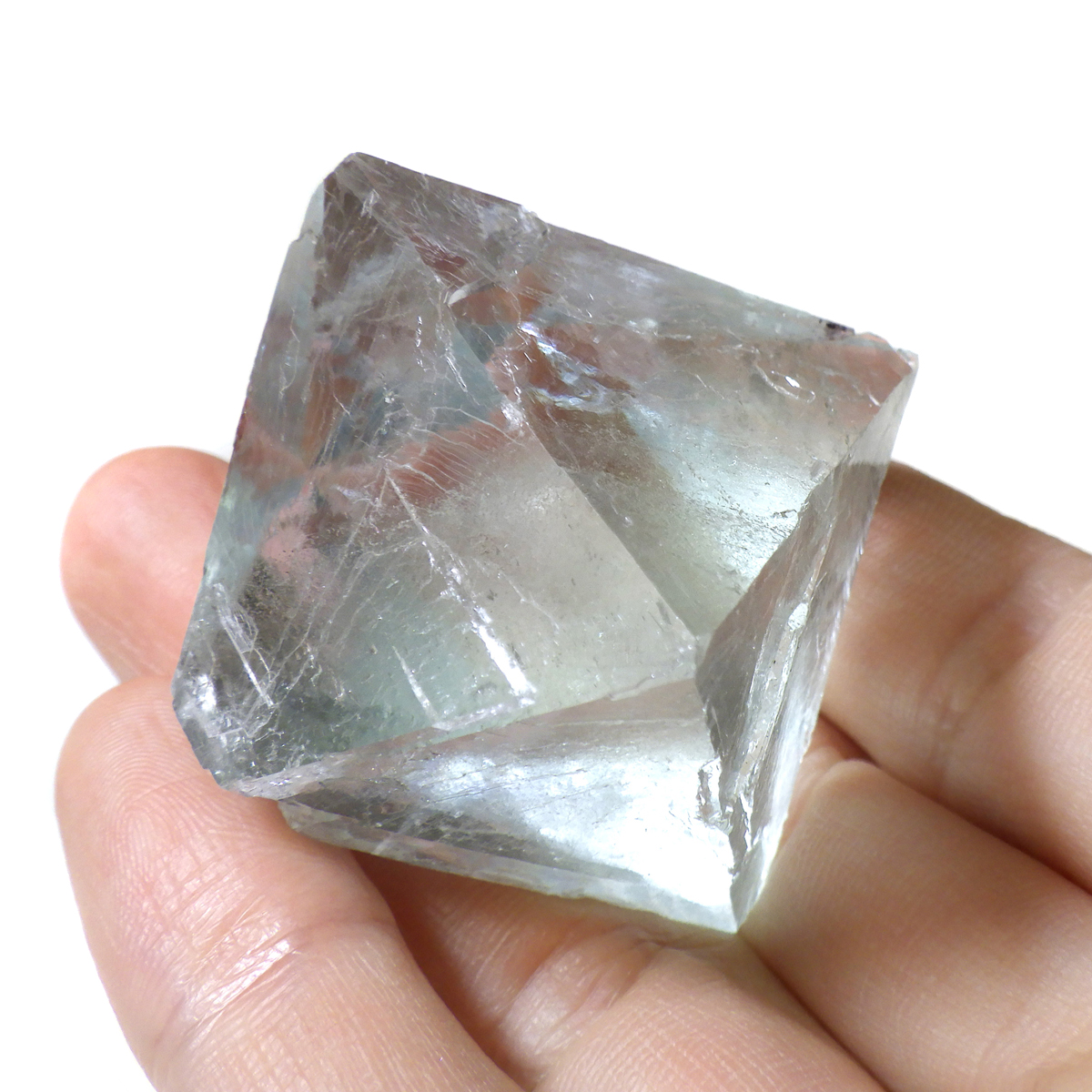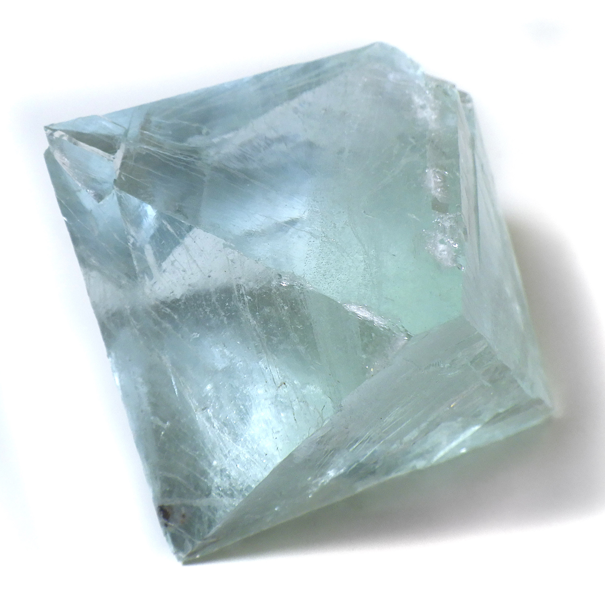 アメリカのイリノイ州ミネルヴァ鉱山産の八面体フローライトです。 この正八面体の形は、蛍石が平面に平行に割れやすい性質を利用して加工したものです。 発色の良い高品質で、光に透かすと一層の美しさが現れます。
