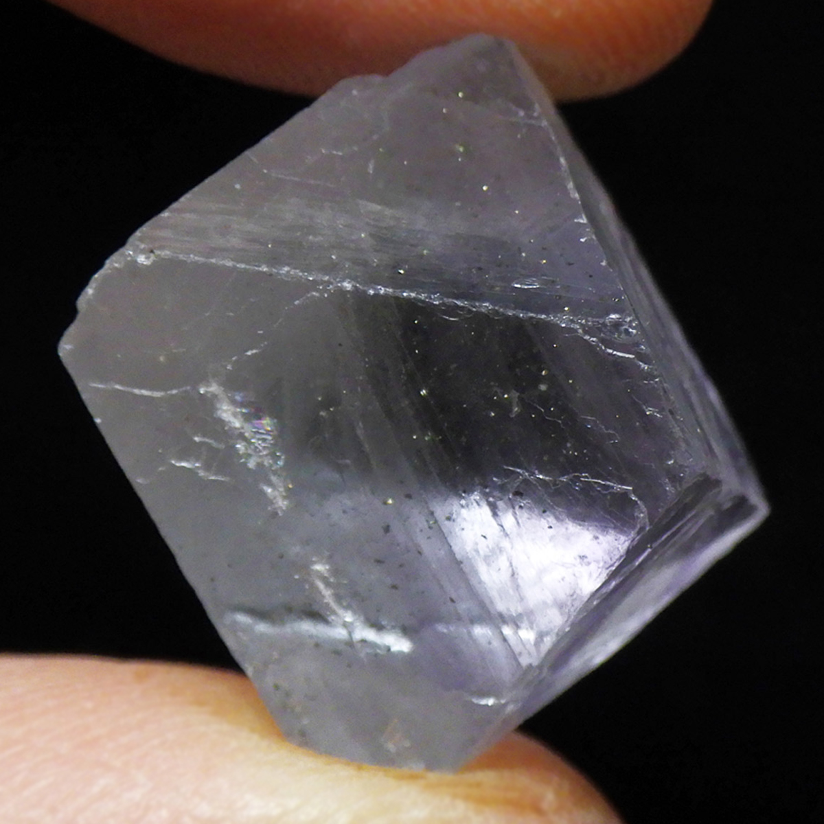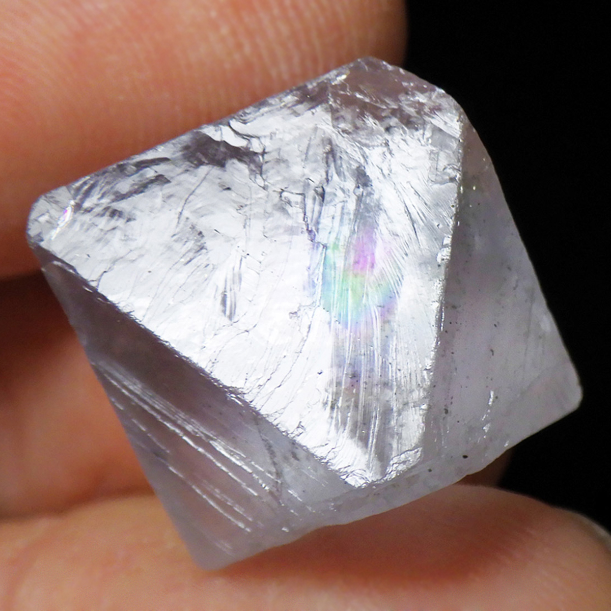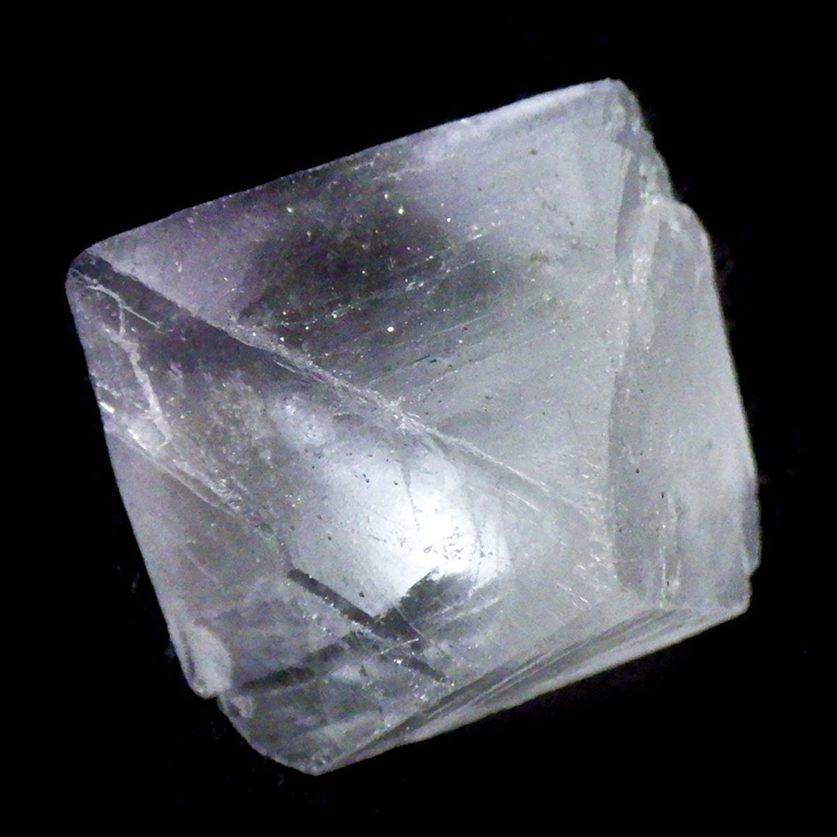 アメリカのイリノイ州ミネルヴァ鉱山産の八面体フローライトです。 この正八面体の形は、蛍石が平面に平行に割れやすい性質を利用して加工したものです。発色の良い高品質で、光に透かすと一層の美しさです。