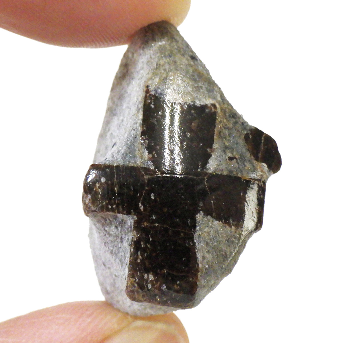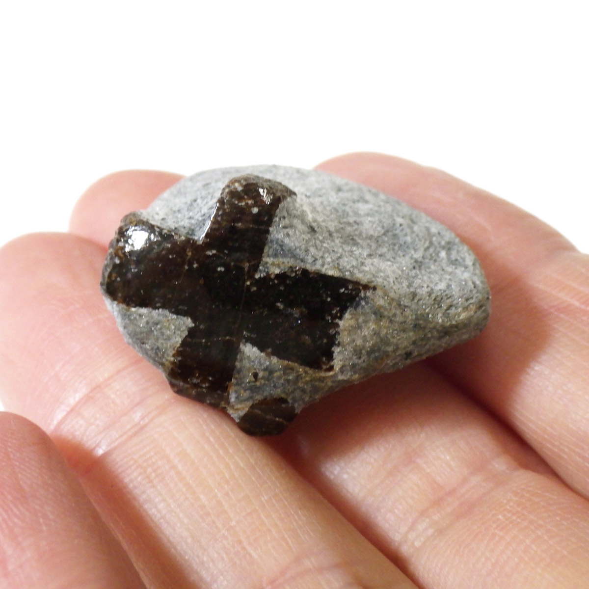スタウロライトの表面部分をポリッシュ(研磨)しており、十字がよりくっきり光り輝いています。表面以外は研磨していません。きっちり90度で交わっているものの方が評価が高くなります。
