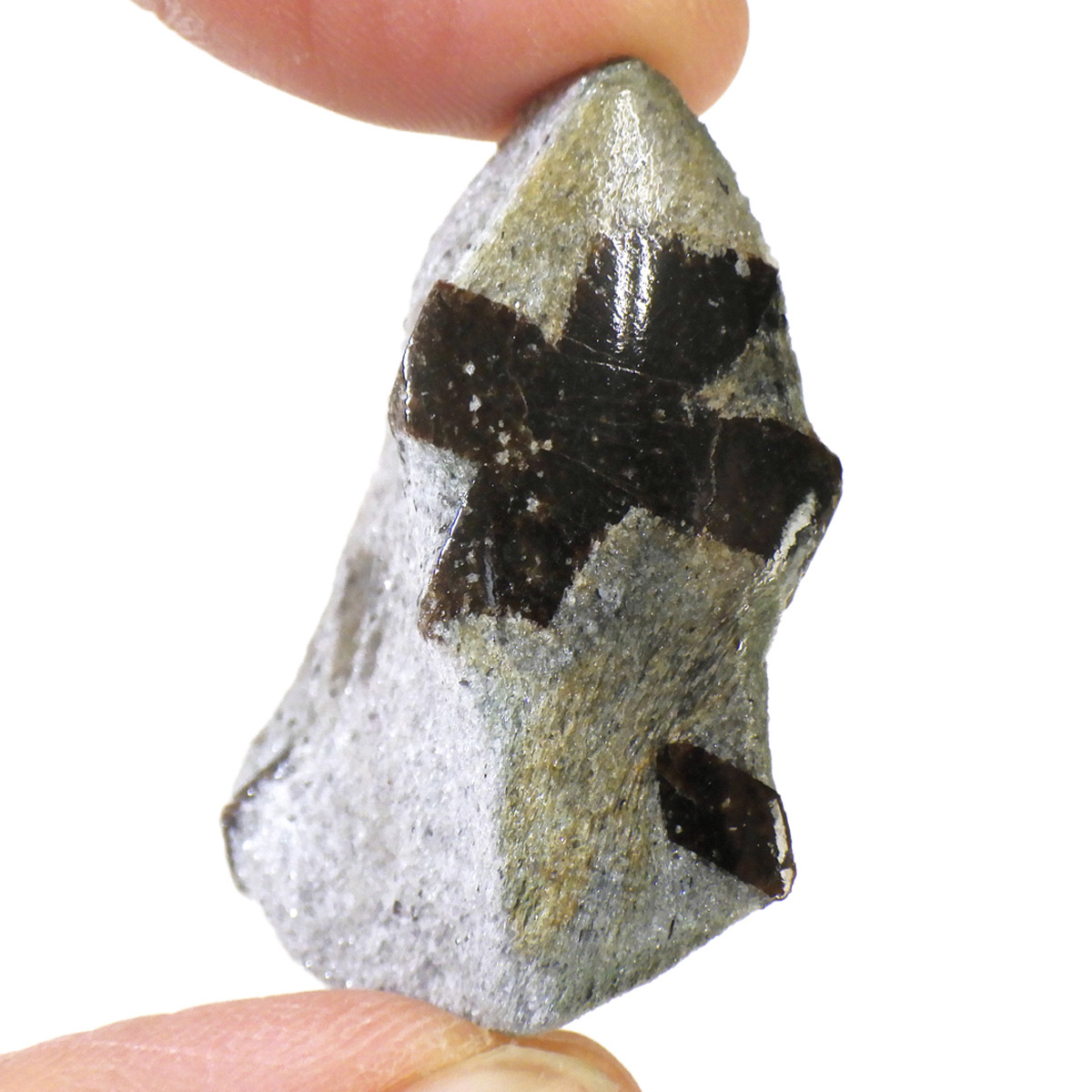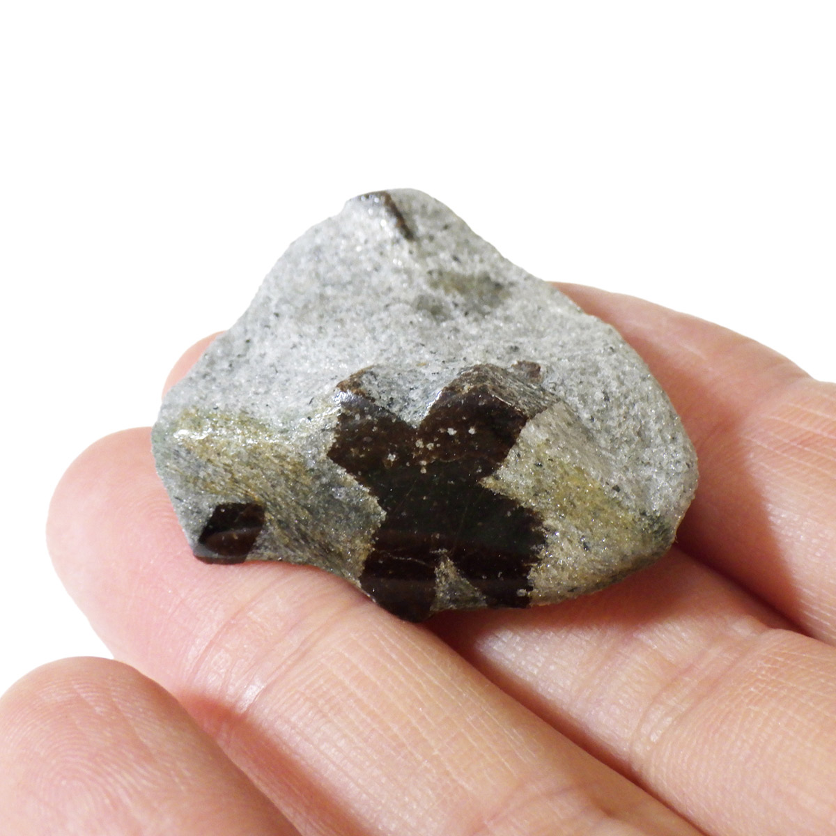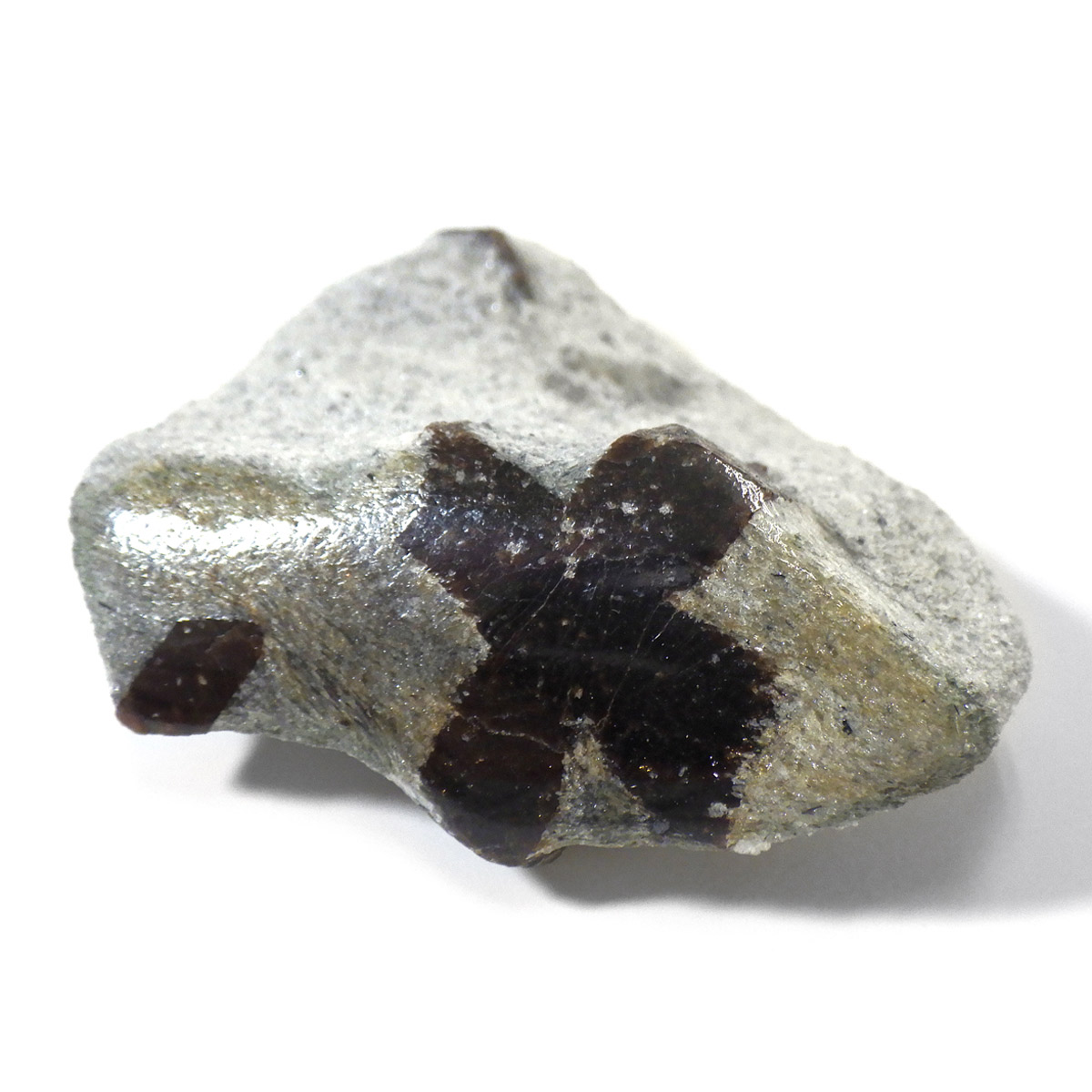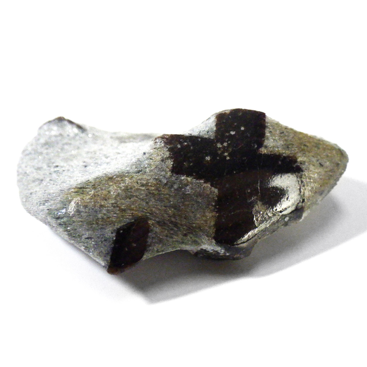 ロシア産のスタウロライト原石です。 スタウロライトの表面部分をポリッシュ(研磨)しており、十字がよりくっきり光り輝いています。表面以外は研磨していません。きっちり90度で交わっているものの方が評価が高くなります。 スタウロライト(十字石)は、中世ヨーロッパで十字軍の兵士たちが自らのシンボルとして持っていたといわれています。二つの結晶が絡み合って一方の結晶に入り込んだ貫入双晶の代表例とされる不思議な鉱物です。