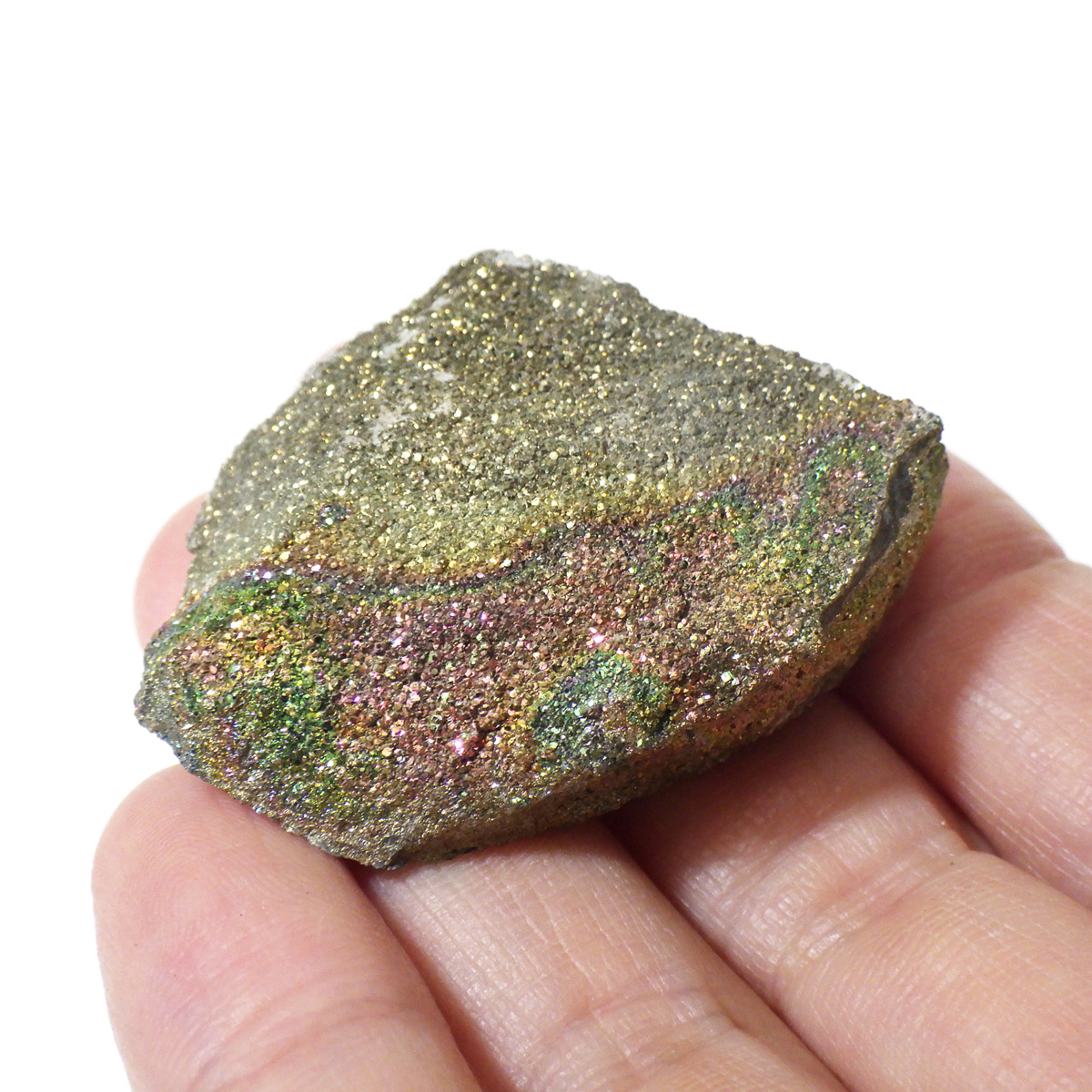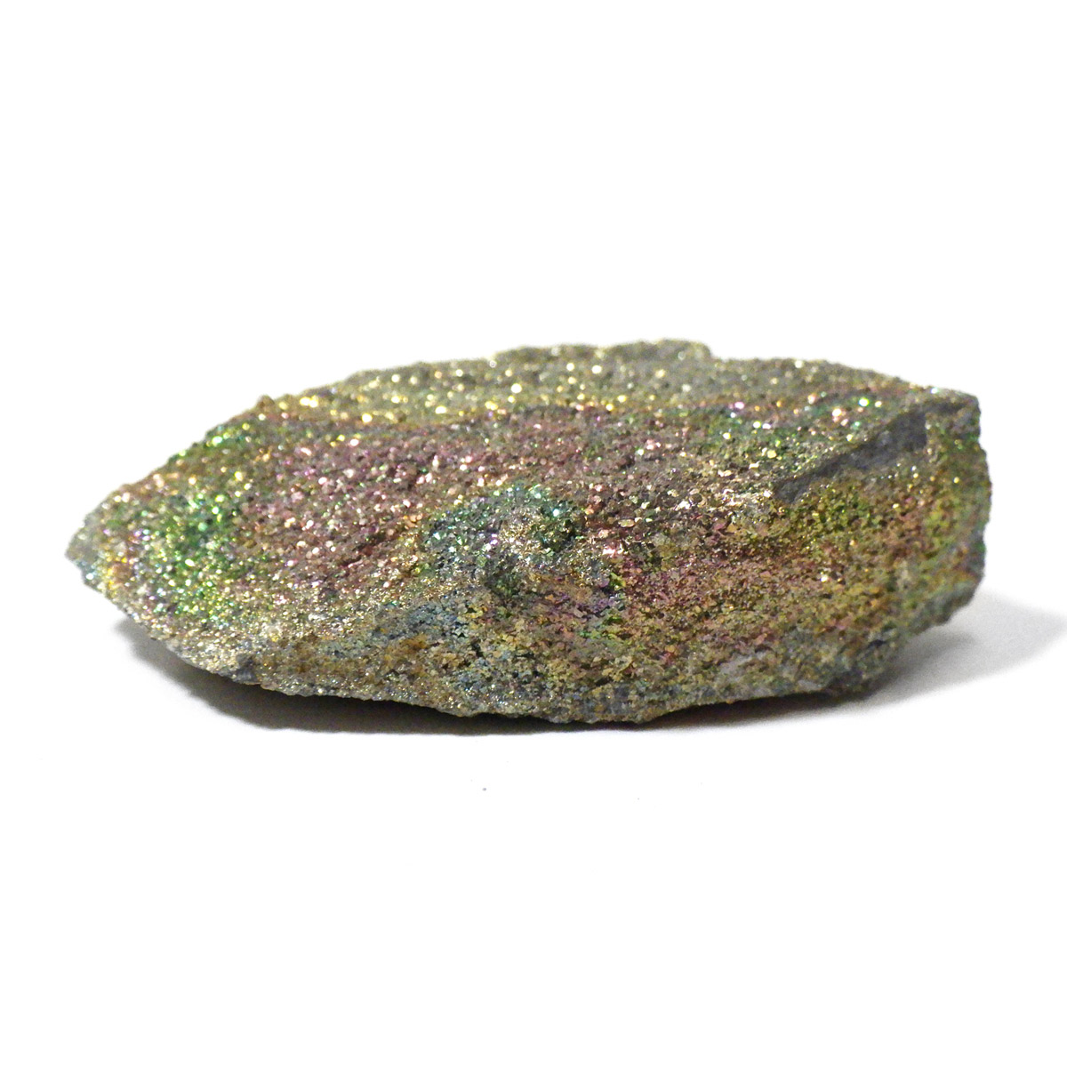 ロシア産チャルコパイライト原石です。卵形の石の塊(ノジュール)を割ると、中から虹色のチャルコパイライトが姿を現します。そのことから現地ではパイライトエッグと呼ばれています。ノジュールを割っても必ずチャルコパイライトが結晶しているわけではないのでキラキラとした綺麗な標本は貴重であります。チャルコパイライトの鮮やかな色で出回っているのもは、人工的に酸化処理を施しているものもありますが、こちらはナチュラルなものになります。時間が経過すると石の断面が酸化して黒ずんだり、鮮やかな虹色に変化する事があります。