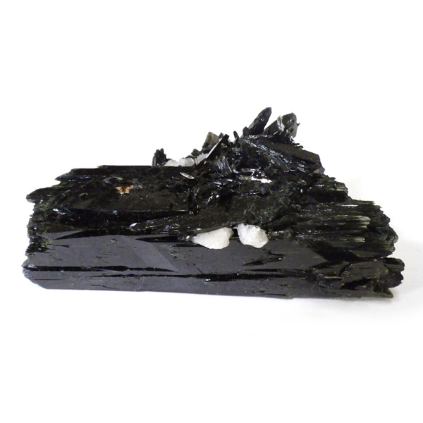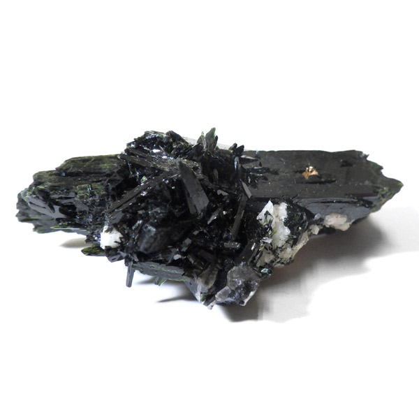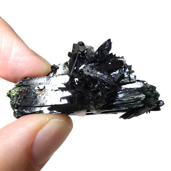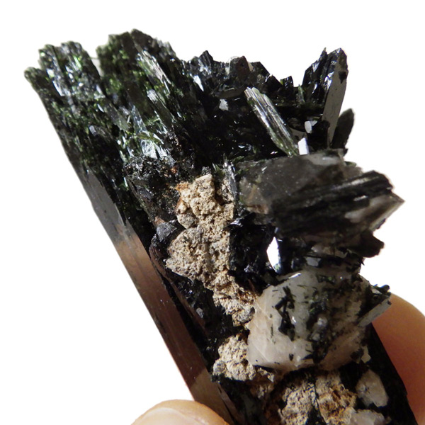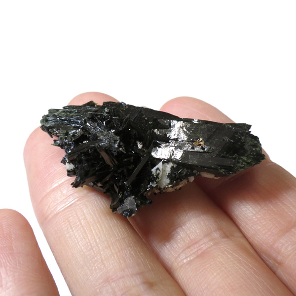 アフリカのマラウイ共和国産のエジリンwithフェルドスパー原石です。エジリンの和名は錐輝石。柱状及び針状の晶癖で表面は光沢があります。濃緑色や黒の色調が確認できます。不透明な白い部分はフェルドスパー(長石)です。小さいながらに大変綺麗な結晶です。
