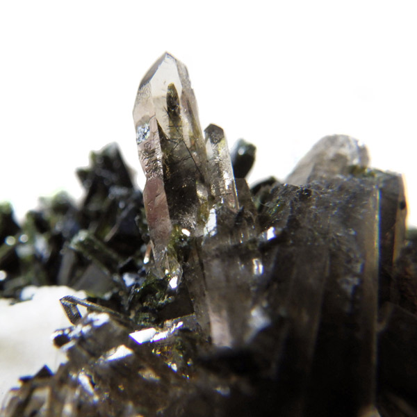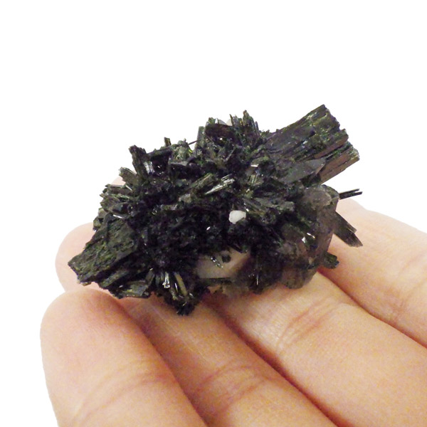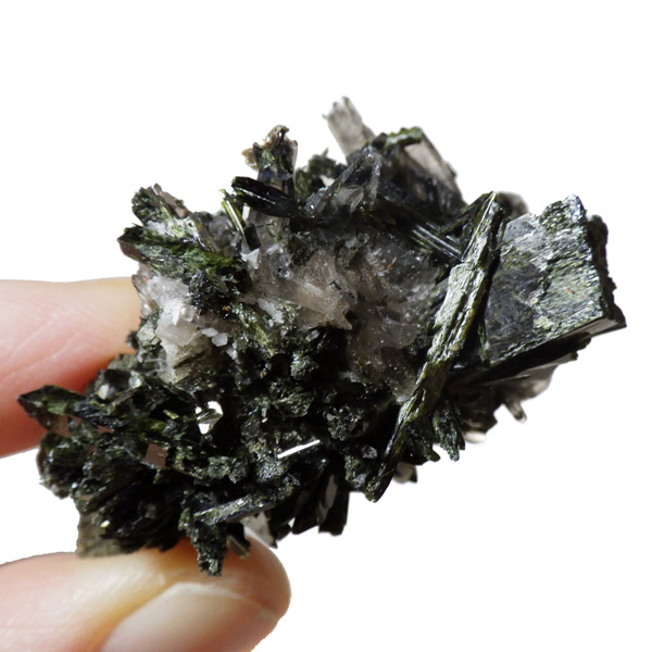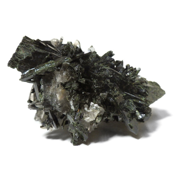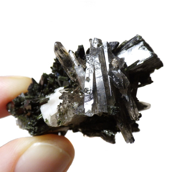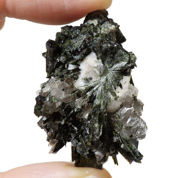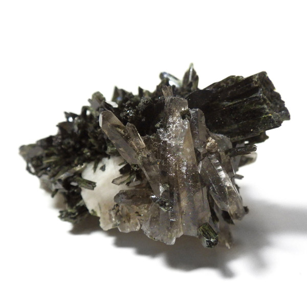 アフリカのマラウイ共和国産のエジリンwithスモーキークォーツandフェルドスパー原石です。エジリンの和名は錐輝石。柱状及び針状の晶癖で表面は光沢があります。濃緑色や黒の色調が確認できます。不透明な白い部分はフェルドスパー(長石)です。スモーキークォーツも共生しています。