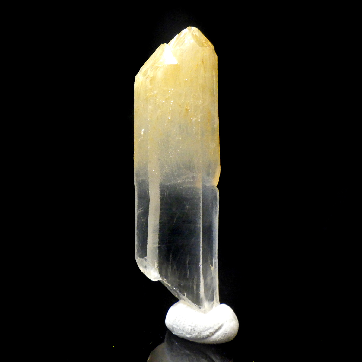 コロンビア・ボヤカ鉱山産のマンゴー水晶です。 マンゴークォーツは近年発見された新しい鉱物で、大変貴重な鉱物になります。 カオリナイトという粘土鉱物の一種のハロイサイトが、水晶に取り込まれて成長した石で、鉱物名は「ハロイサイトインクォーツ」といいます。 先端が優しいマンゴー色になっており、水晶部分からのグラデーションが見事です。