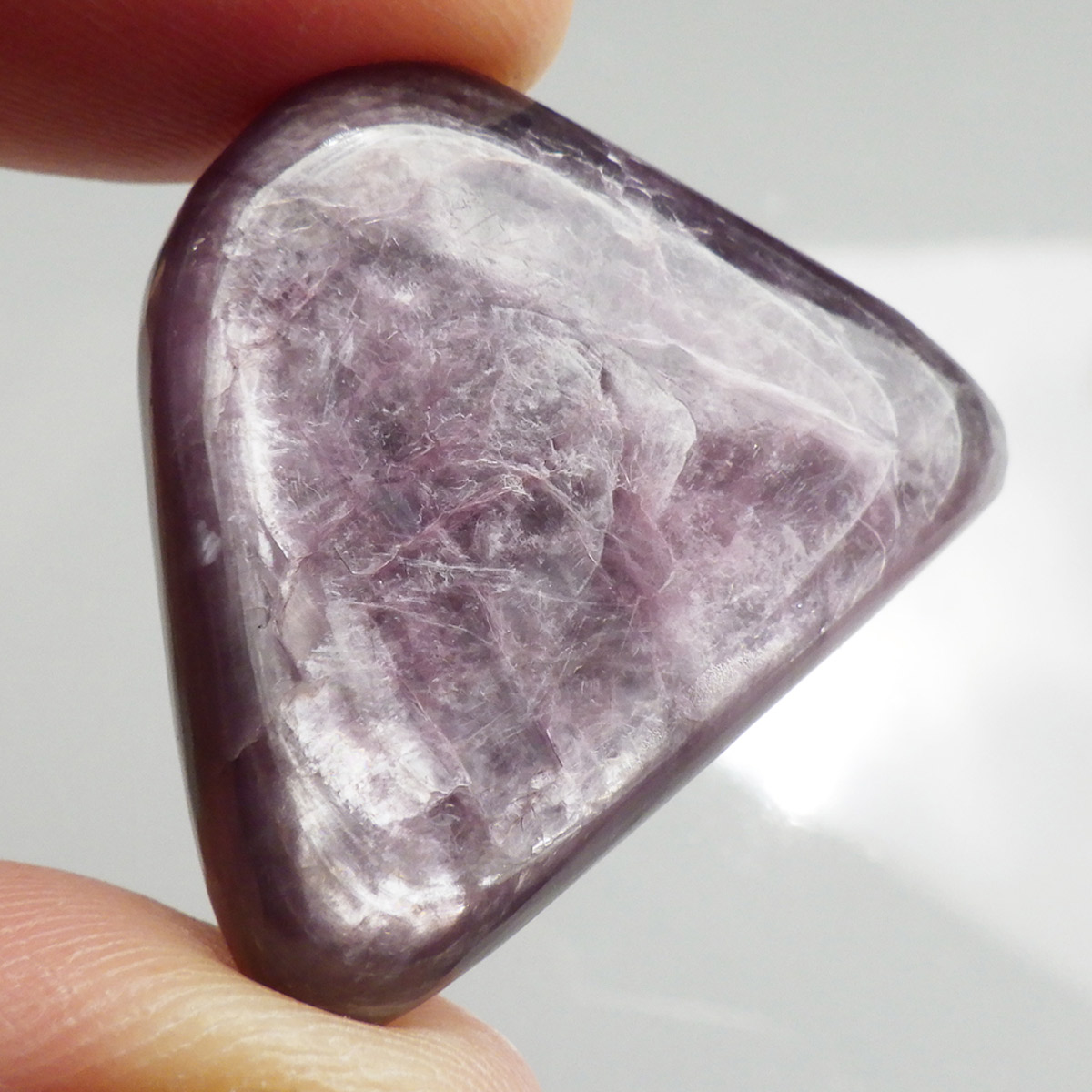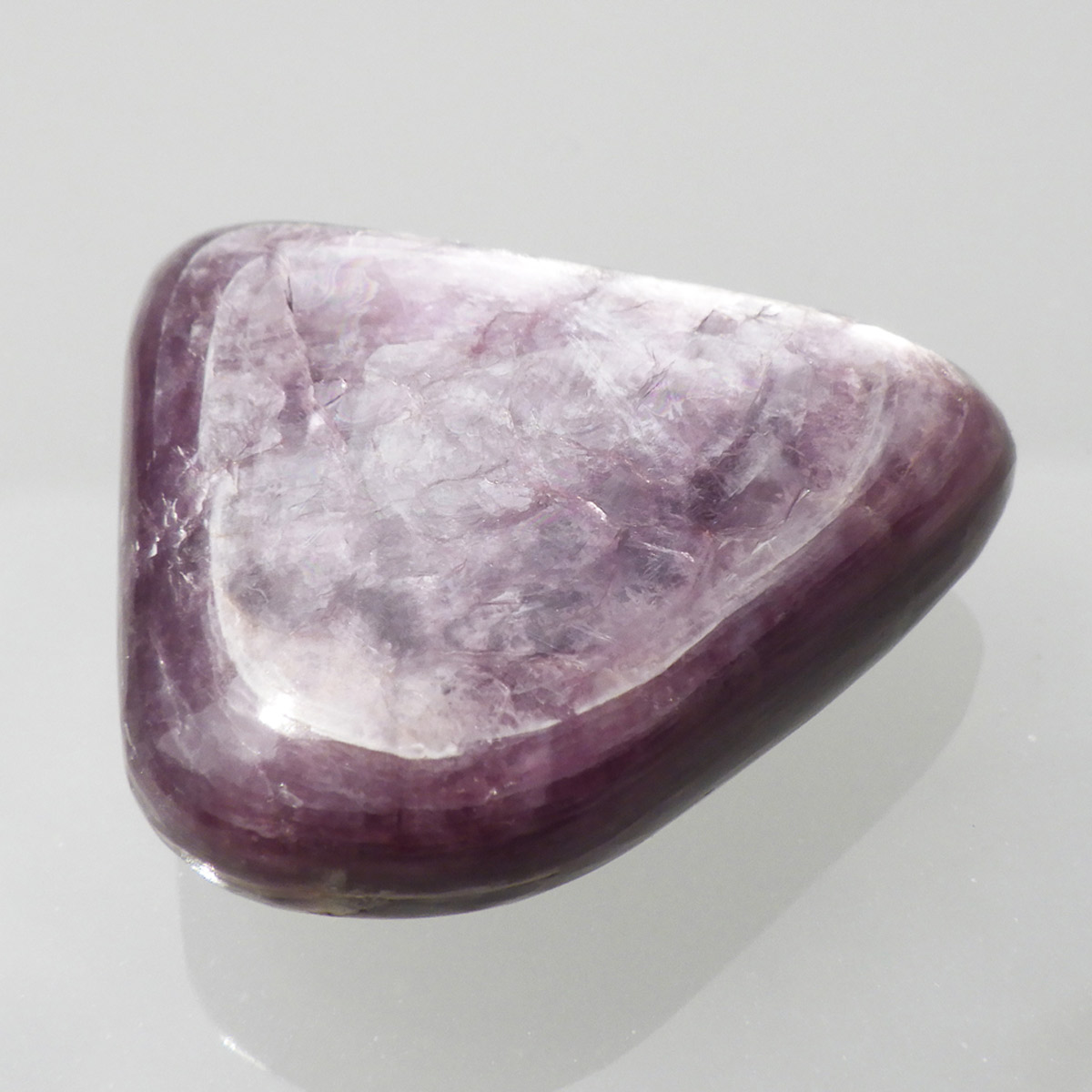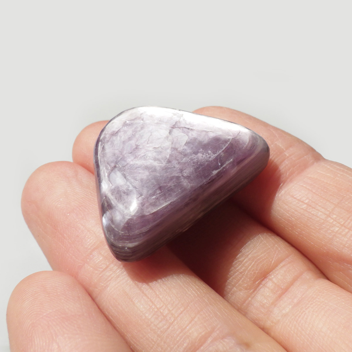 ブラジル産レピドライト、タンブルです。レピドライトの最大の特徴は、落ち着いたシルバーパープルの色合いと、光の当たる角度によって見られる、ガラス光沢のキラキラとした美しい輝きです。これはリチウムの発光によるもので、和名を「リチア雲母」といい、この輝きは雲母によるものです。 レピドライトの中でもここまでの光沢ある輝きはなかなか出会えない質の良い一点です。
