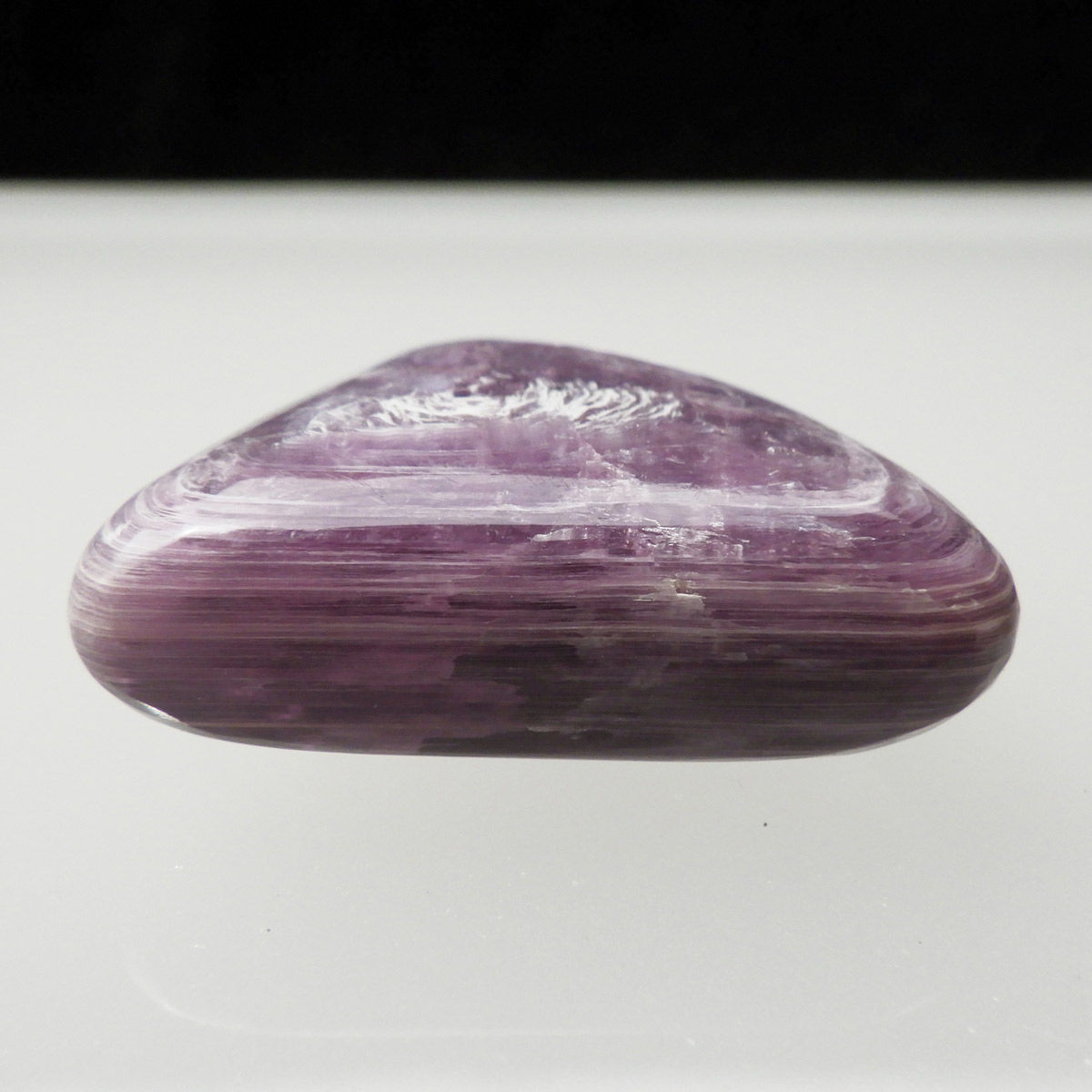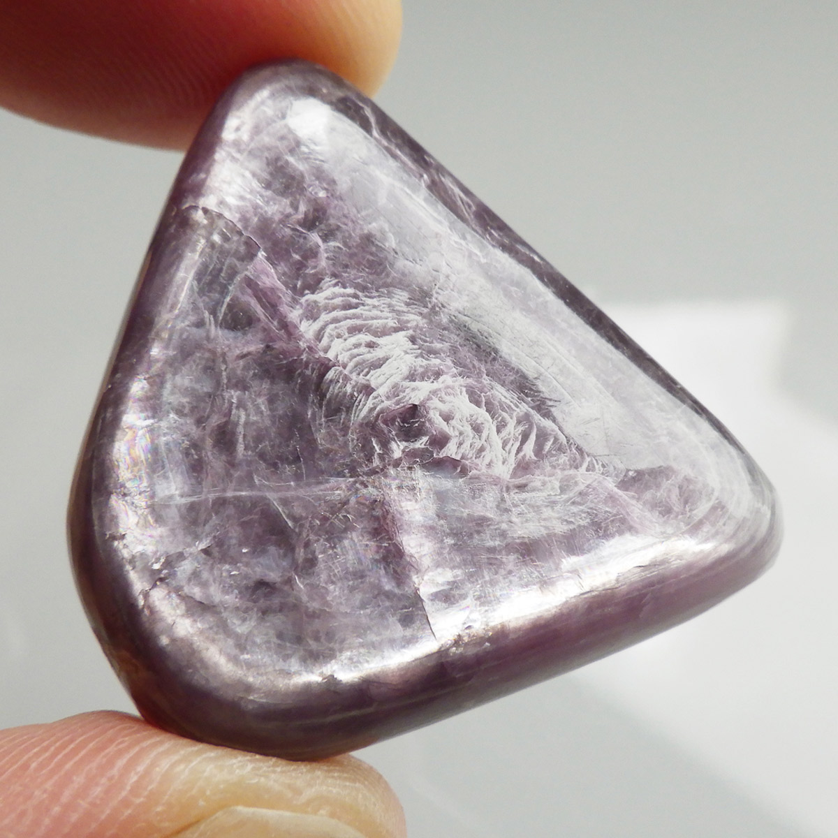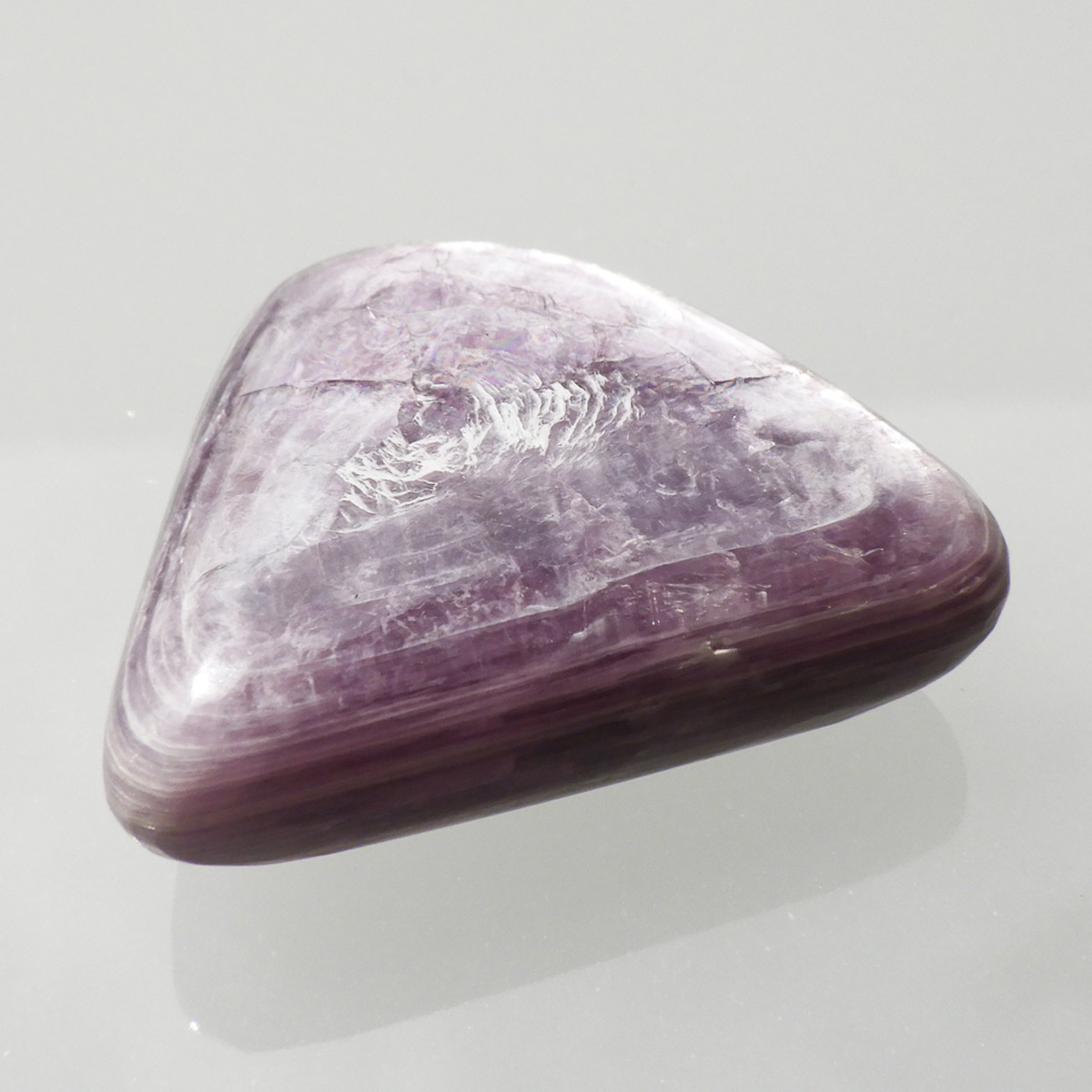 ブラジル産レピドライト、タンブルです。レピドライトの最大の特徴は、落ち着いたシルバーパープルの色合いと、光の当たる角度によって見られる、ガラス光沢のキラキラとした美しい輝きです。これはリチウムの発光によるもので、和名を「リチア雲母」といい、この輝きは雲母によるものです。 レピドライトの中でもここまでの光沢ある輝きはなかなか出会えない質の良い一点です。
