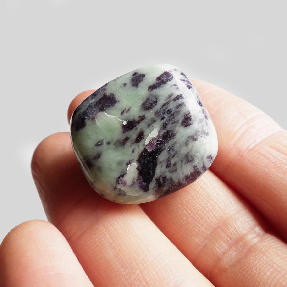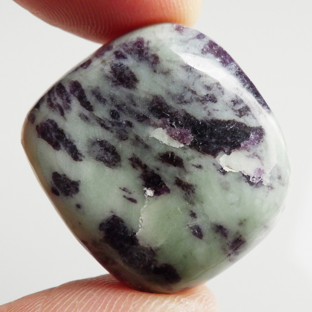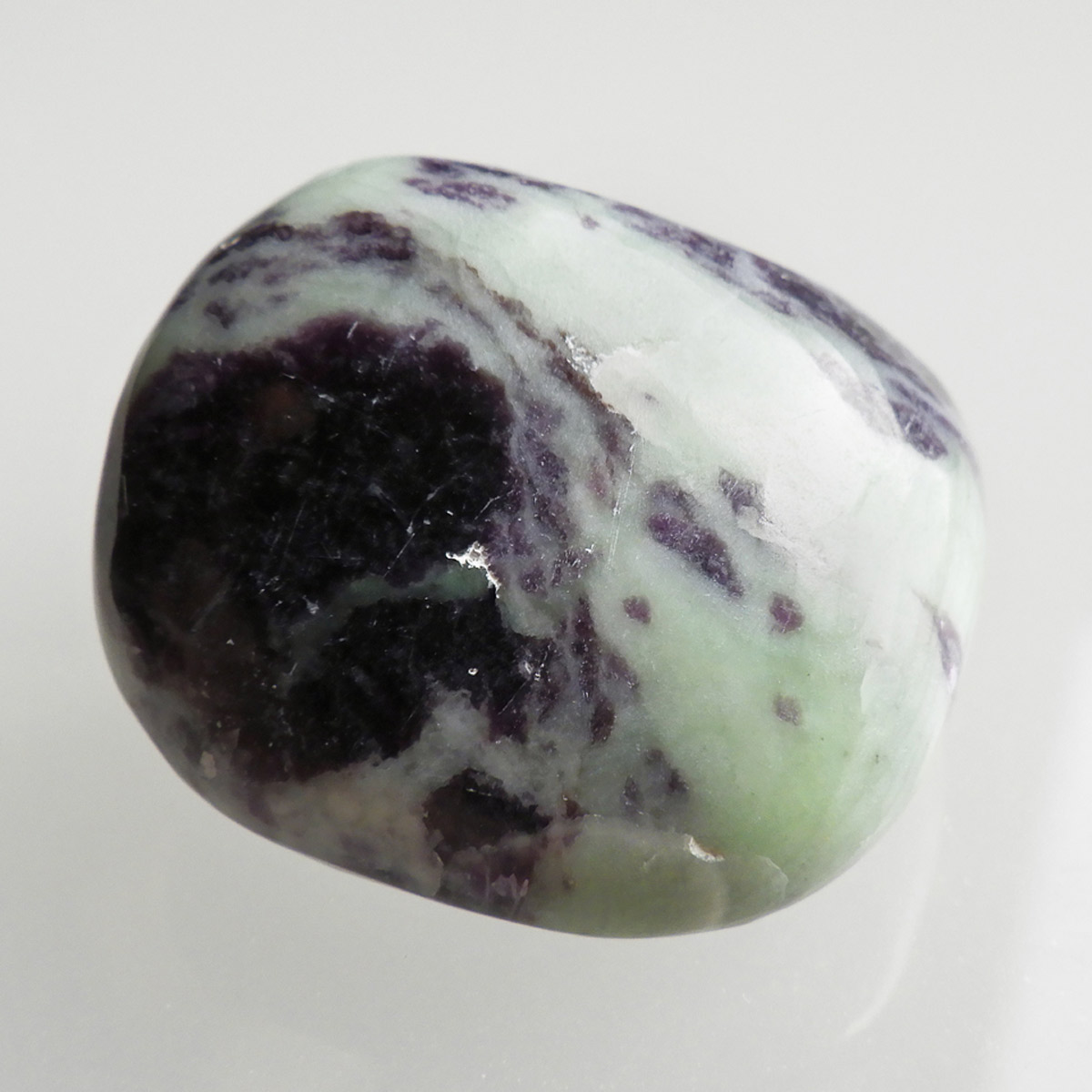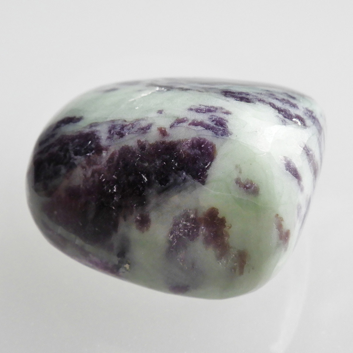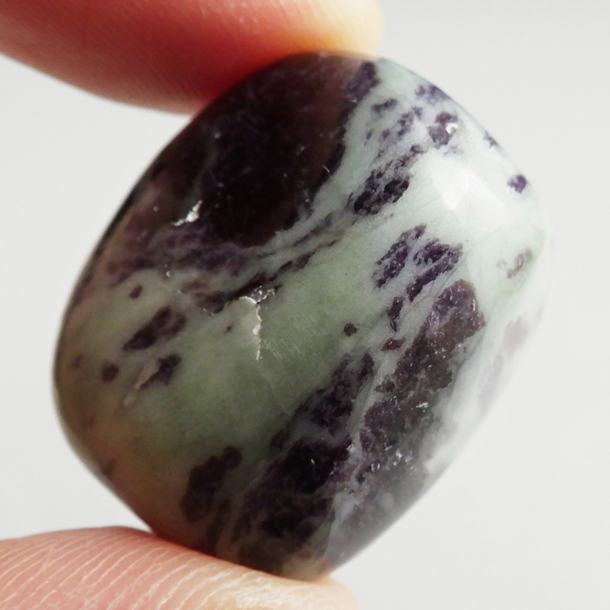 インド産ケンメレライト、タンブルです。 ケンメレライトはその色にちなんで和名で菫泥石と呼ばれています。ケンメレライトはロシアの化学者A. A.Kammererにちなんで名付けられています。ケンメレライトが最も近い表記だと思いますが、ローマ字読みでカメレライトとも表記されることがあります。緑泥石グループに属するクリノクロアがクロムを含み赤紫色を呈した亜種で、この鮮やかな赤紫色が特徴です。紫はケンメレライト、緑はサーペンティン(蛇紋石)。