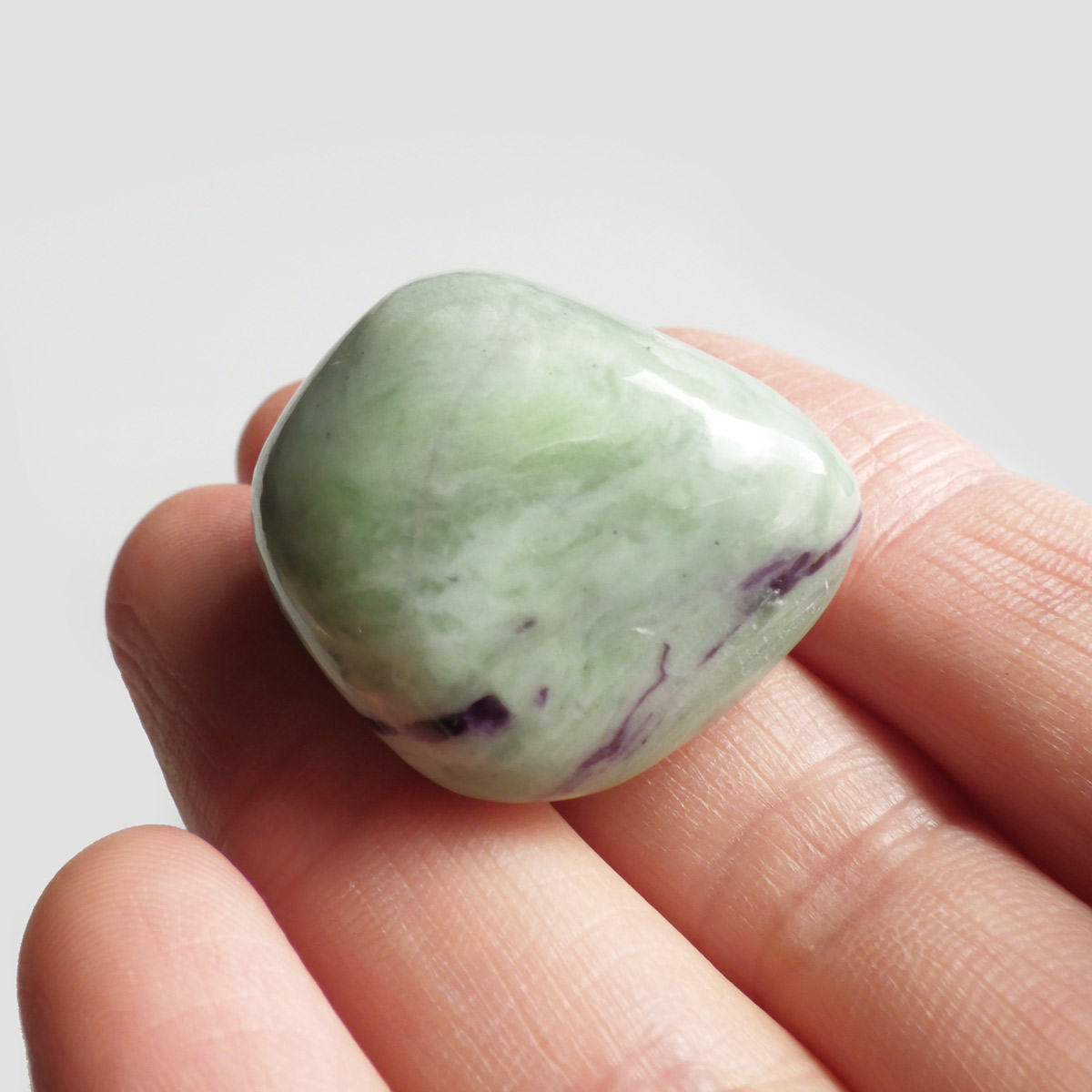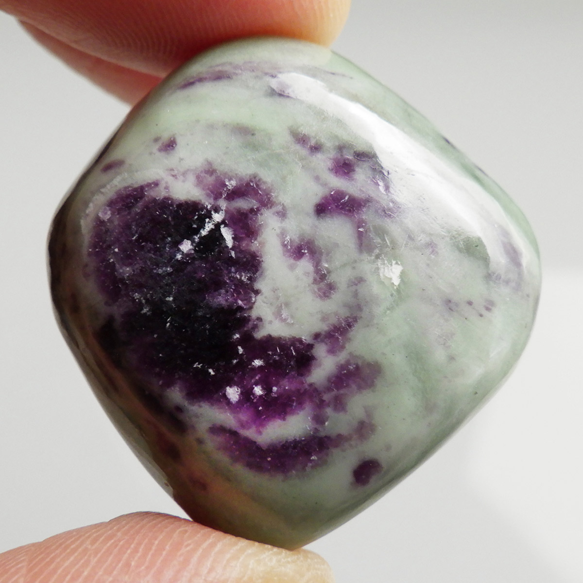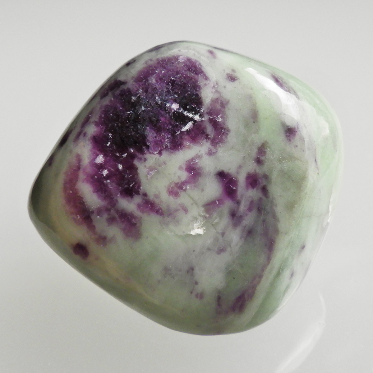 ケンメレライトはその色にちなんで和名で菫泥石と呼ばれています。ケンメレライトはロシアの化学者A. A.Kammererにちなんで名付けられています。ケンメレライトが最も近い表記だと思いますが、ローマ字読みでカメレライトとも表記されることがあります。緑泥石グループに属するクリノクロアがクロムを含み赤紫色を呈した亜種で、この鮮やかな赤紫色が特徴です。紫はケンメレライト、緑はサーペンティン(蛇紋石)。