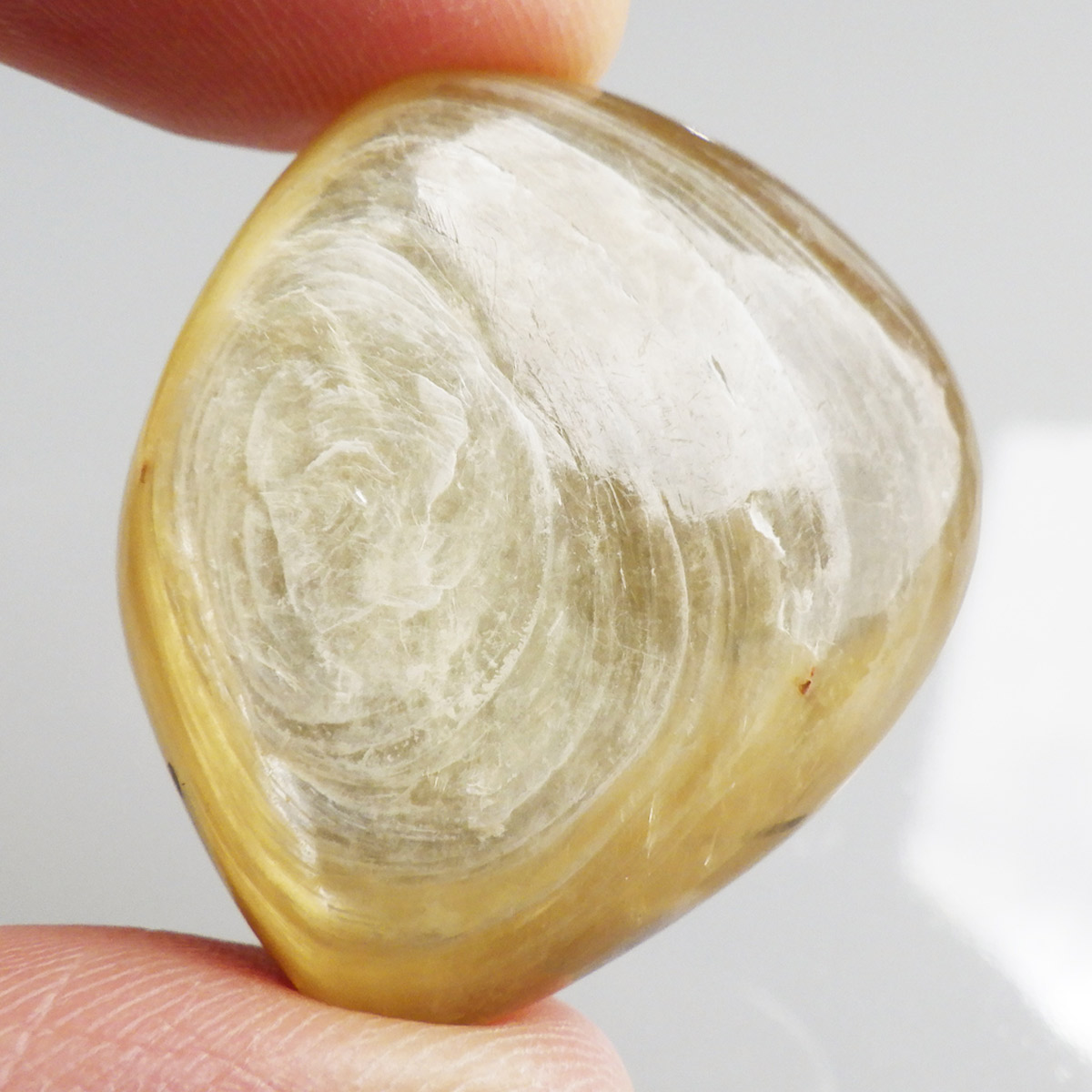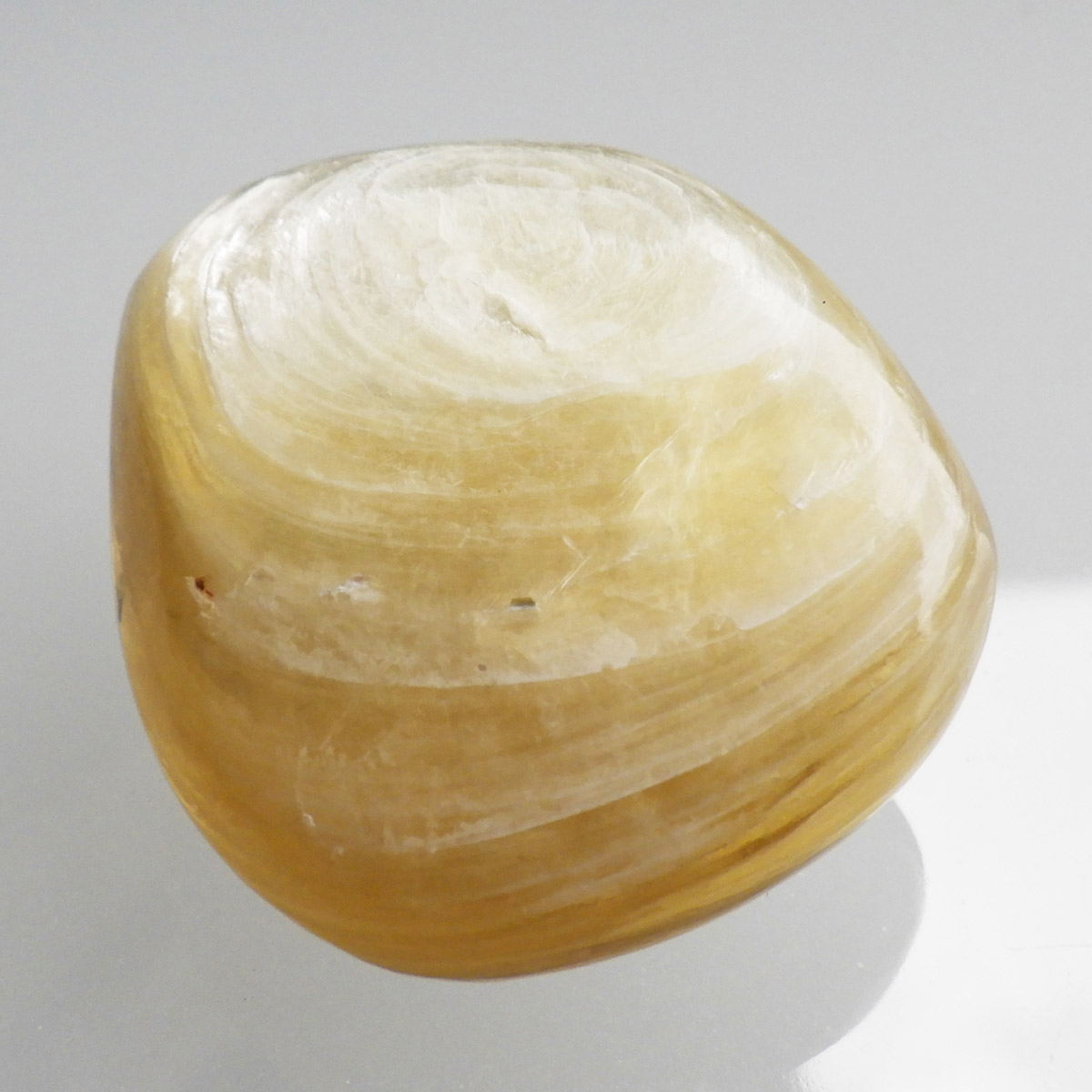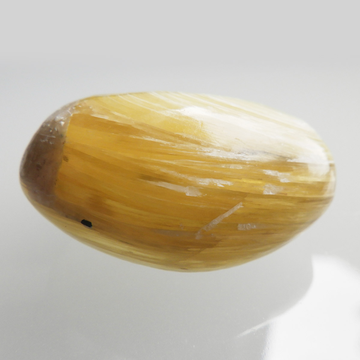 ブラジル産ゴールデンマイカ、タンブルです。ゴールデンマイカの最大の特徴は淡い金色の色合いで、光の当たる角度によって見られる、ガラス光沢のキラキラとした美しい輝きです。和名を「白雲母」といい、この輝きは雲母によるものです。ゴールデンマイカの中でもここまでの光沢ある輝きはなかなか出会えない質の良い一点です。