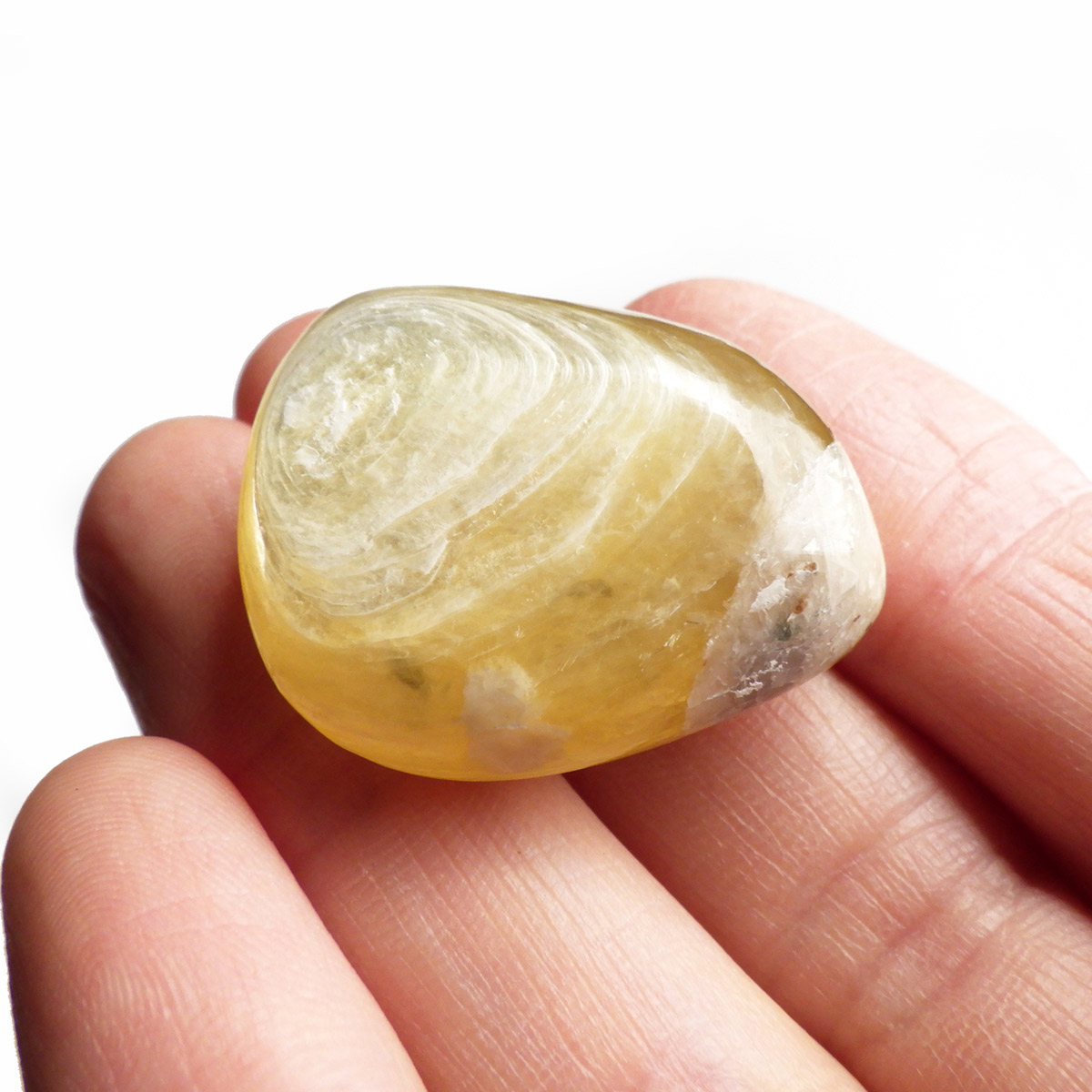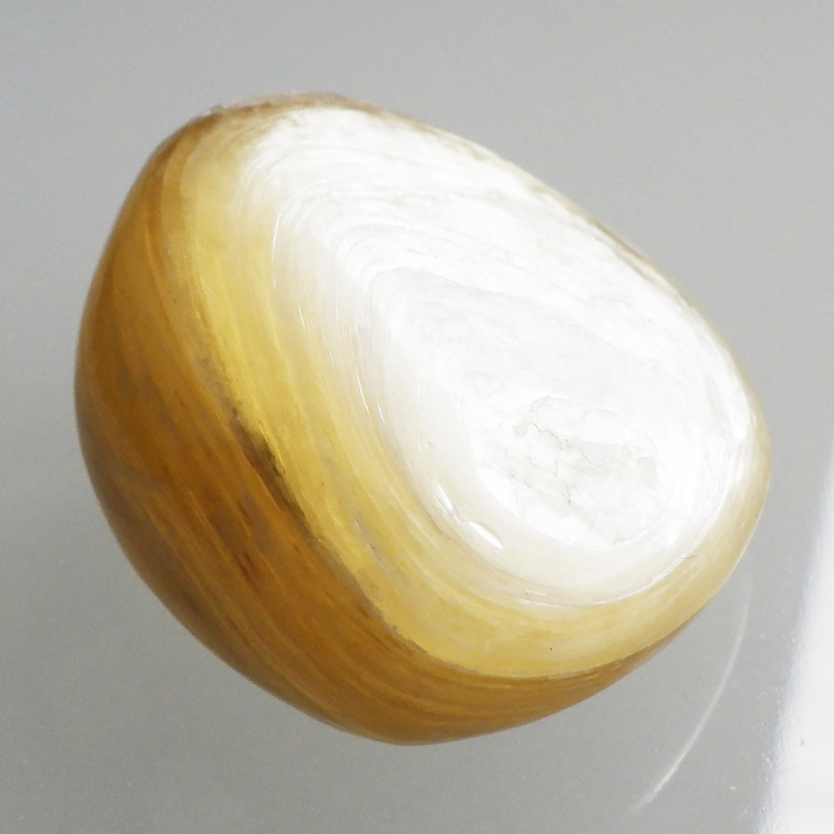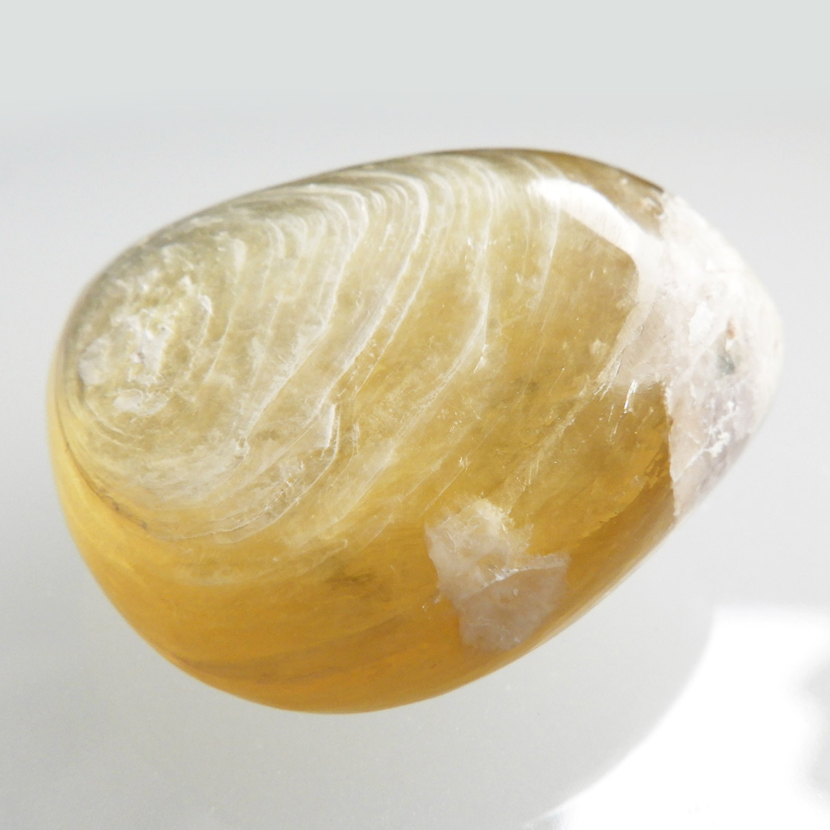 ブラジル産ゴールデンマイカ、タンブルです。ゴールデンマイカの最大の特徴は淡い金色の色合いで、光の当たる角度によって見られる、ガラス光沢のキラキラとした美しい輝きです。和名を「白雲母」といい、この輝きは雲母によるものです。ゴールデンマイカの中でもここまでの光沢ある輝きはなかなか出会えない質の良い一点です。