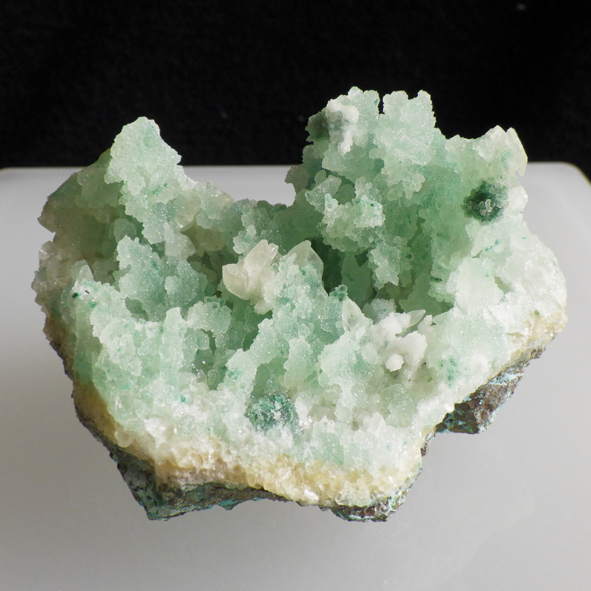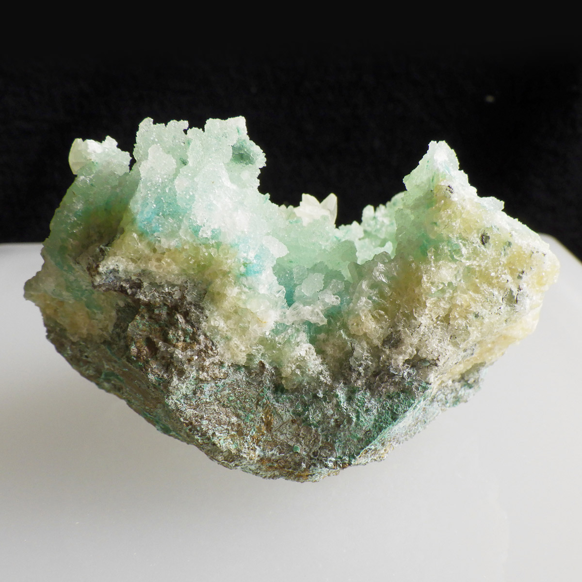 大変珍しい、母岩付きジェムシリカの原石です。 ジェムシリカとは、クリソコラをベースに水晶(石英)が長い年月をかけて混じりあったもの。青い部分がクリソコラ、青の半透明の部分がジェムシリカ、その上の無色透明の部分が水晶です。非常に貴重で、限られた条件の下でしか生成されないため産出量が極めて少ない鉱物です。